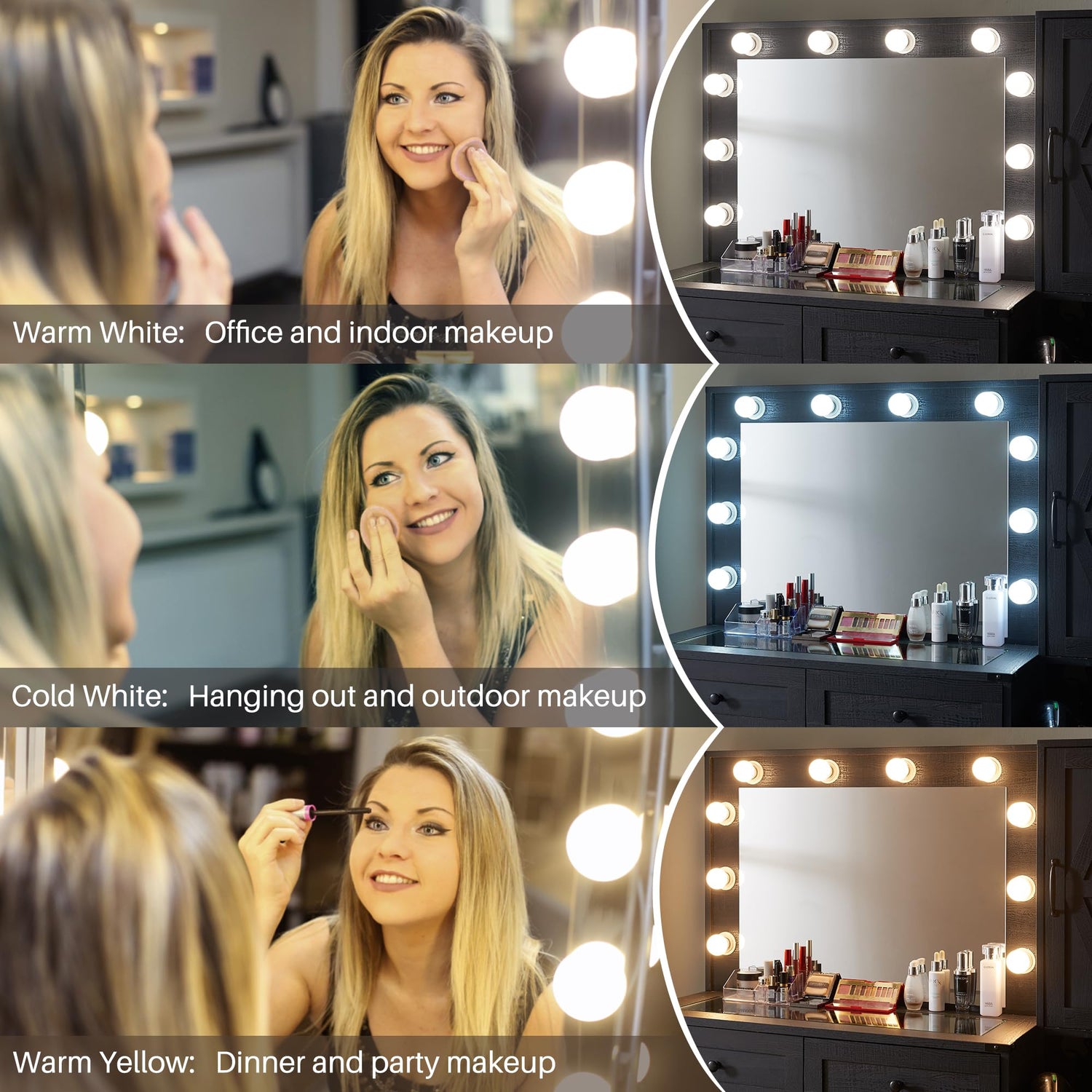 - 【Hollywood Lighted Mirror】There are 10 LED bulbs with 3 color modes on the mirror, touch the switch to change the lighting color easily. You will feel like a queen every morning and night as wearing makeup or combing hairs when some gentle lights shine on you, which makes it definitely a dream gift for all men's wife, daughter, mother