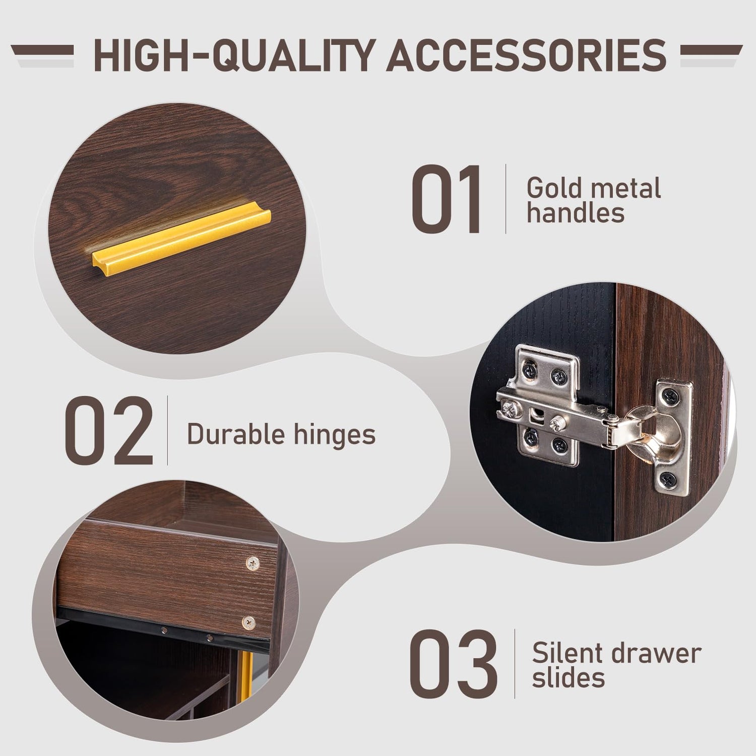 - 【Sleek & Versatile Design】 Elevate your space with this modern sideboard, blending clean lines and rustic wood-grain finish. Framed by 2 tempered glass cabinet doors and accented with brushed-gold metal handles, it adds understated elegance to any room. bar cabinets' neutral aesthetic effortlessly complements contemporary, farmhouse, or transitional décor, making it a seamless addition to dining rooms, kitchens, or living areas.