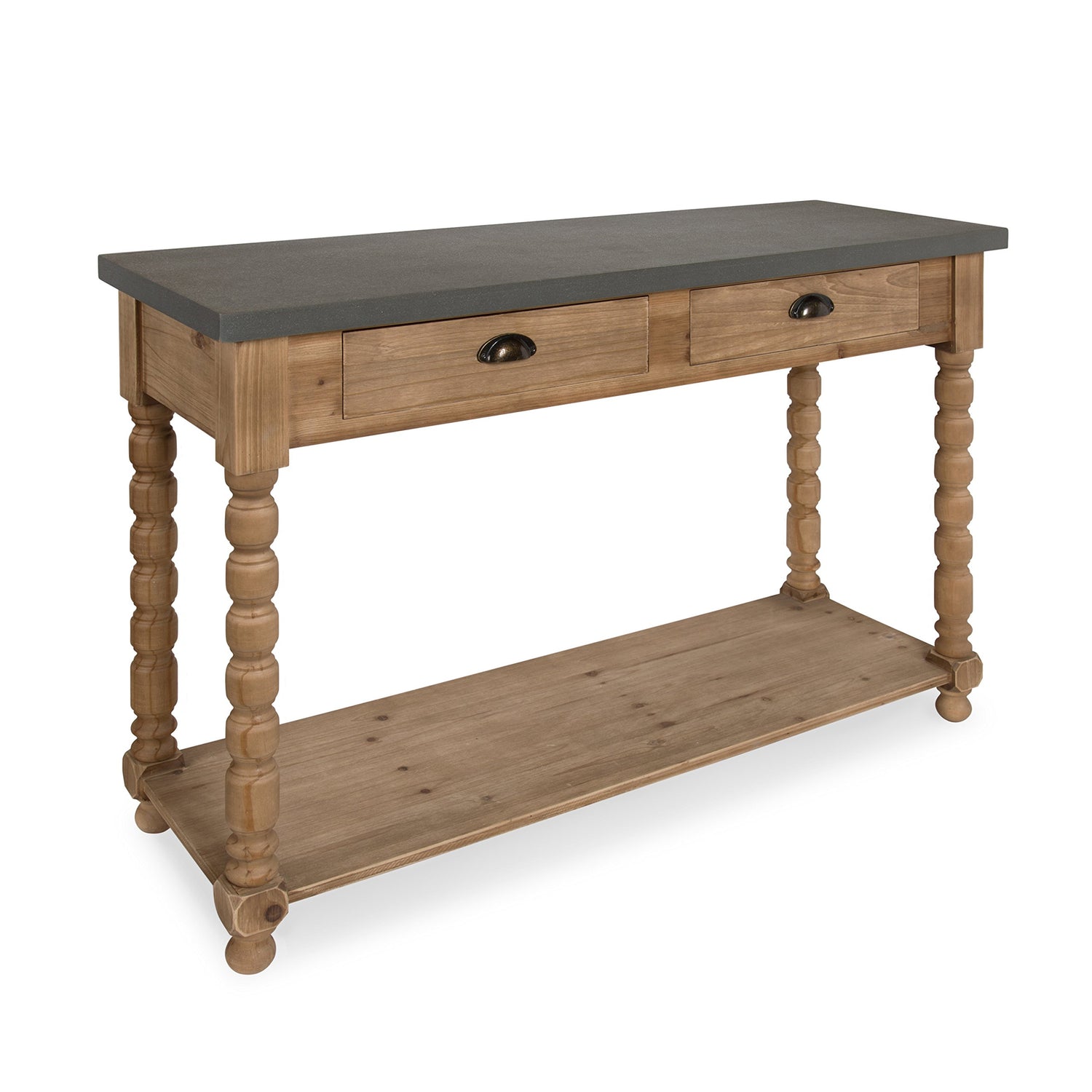 Details: Warmly exhibit your family photos, memorabilia or any number of your favorite home decor accents on this beautiful, farmhouse chic console. Constructed of solid wooden material, the rustic brown distressed wood finish and lyrical spindle legs create a genuine warmth while the vibrant contrast of the concrete gray top completes an authentically charming piece. The 48-inch width makes it the perfect size to use in many places within your home. In the hallway, it makes a fantastic entry table or place it in the dining room as a bar or serving area. This console could also be set in a bedroom as a tremendous feature under a mirror or even, at 16 inches deep, to support a smaller flat screen TV for a guest room. A truly versatile piece of furniture, the Rutledge console is a practical luxury. The overall dimensions are 48 inches wide by 16 inches deep and 32.5 inches tall. The two drawers measure 15.25 x 12.75-inches inside, and each has an attractive vintage brass knob that attaches securely to the front. The bottom platform shelf is 45 x 14.5-inches with 21.5-inches of space to the drawers above.