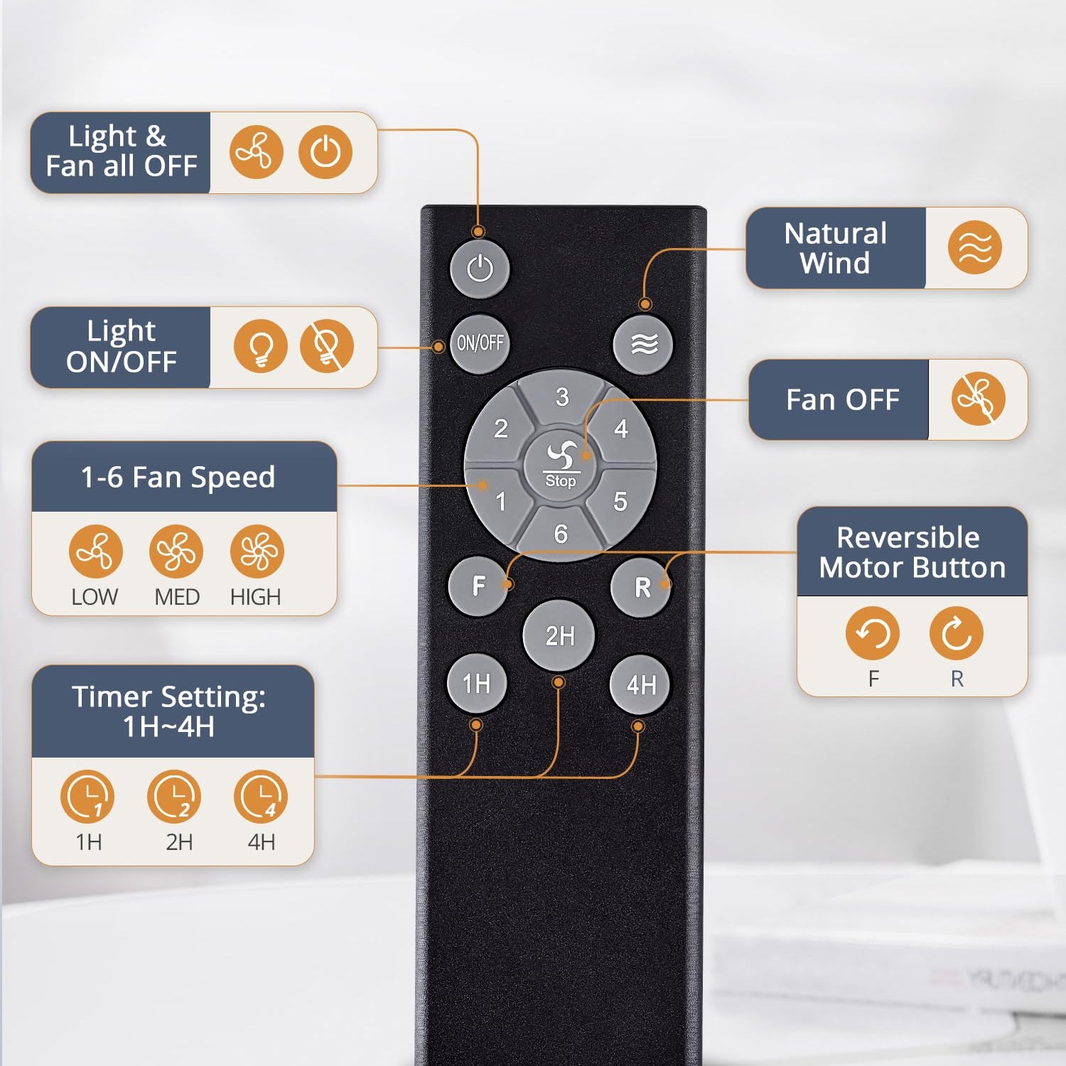 • Simple Remote Control: The silent Remote operates without any beeping, ensuring quiet convenience without disturbing your family. Easily handle 5 key features with the remote: 6 wind speeds, reversible mode, 1/2/4-hour timer, natural wind mode and control the fan or light separately, provides remarkable convenience