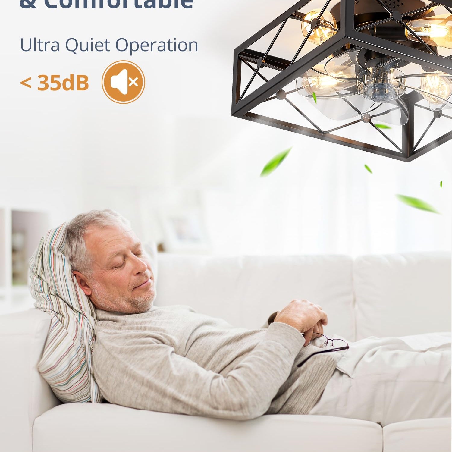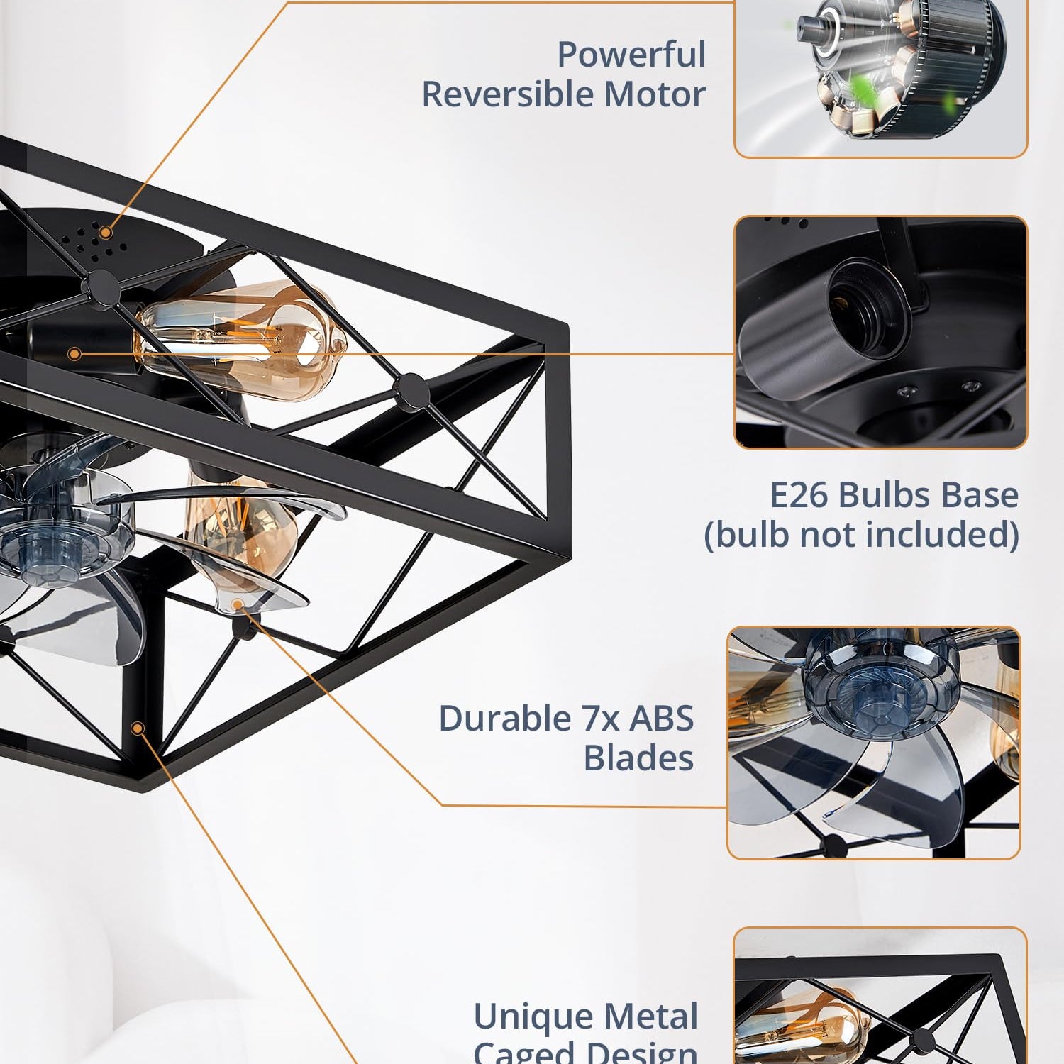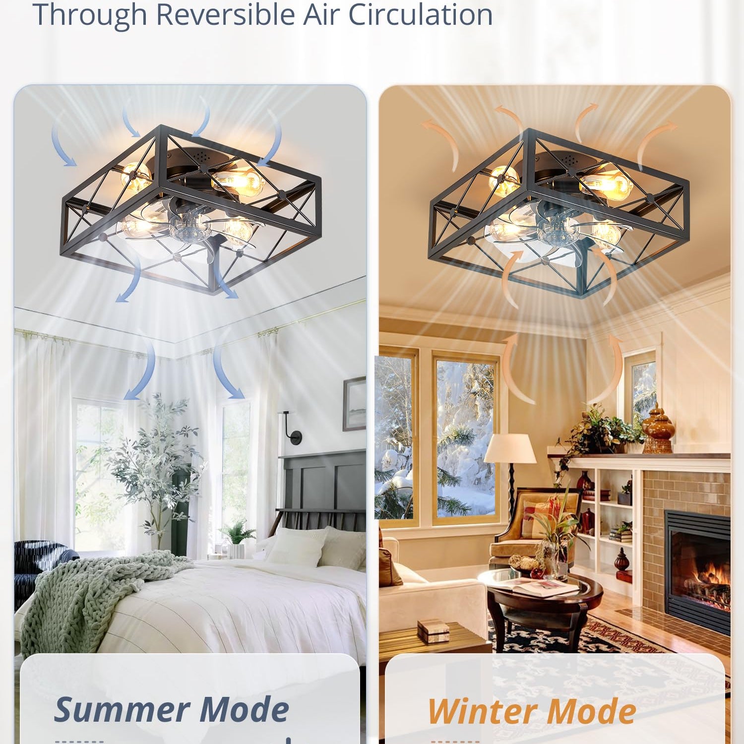 • Square Caged Design: The farmhouse ceiling fan boasts a unique square black metal cage design, and the intersecting pattern on the cage adds an artistic touch to this rustic ceiling fan. The small ceiling fan fits well in most spaces, complementing bedrooms, kitchen and living rooms perfectly, bringing a rich blend of industrial and rustic styles to your home decor