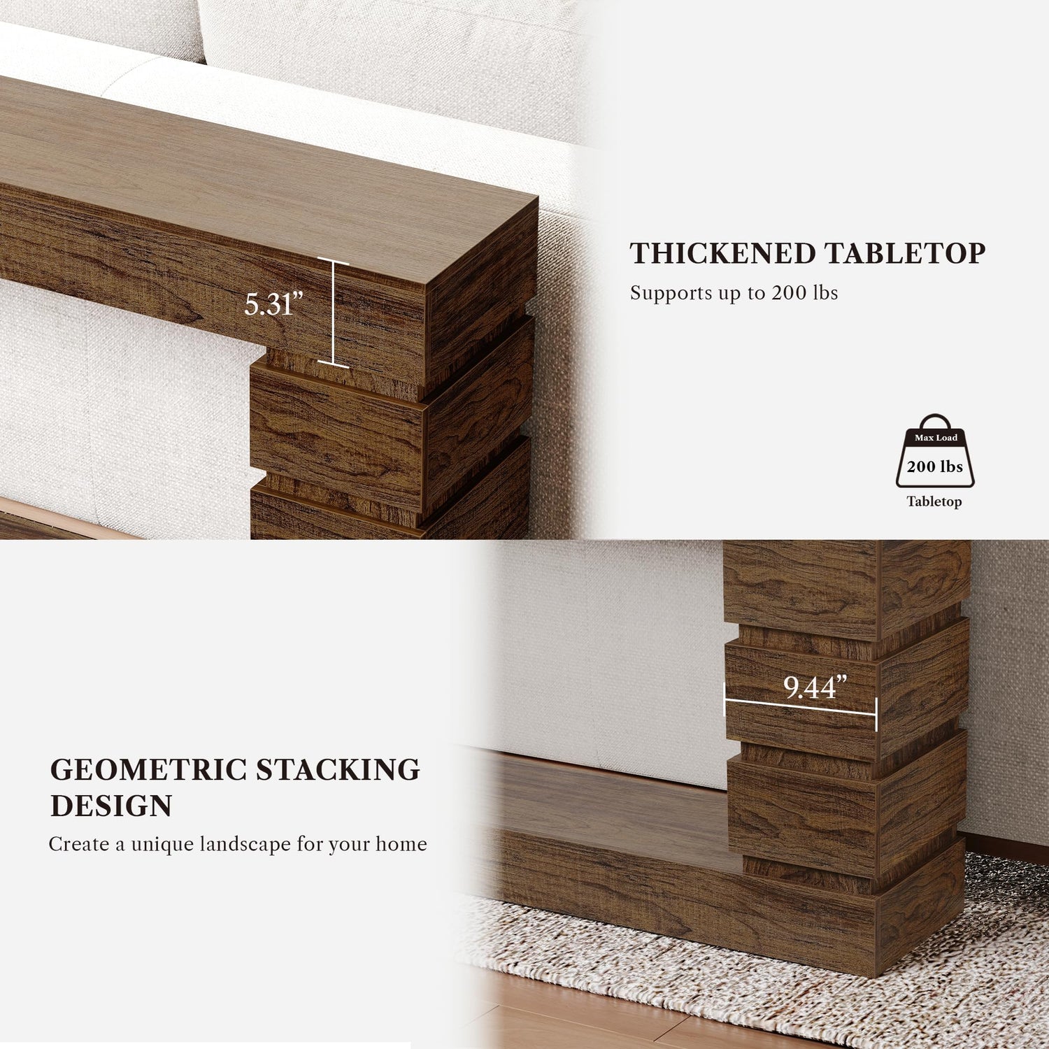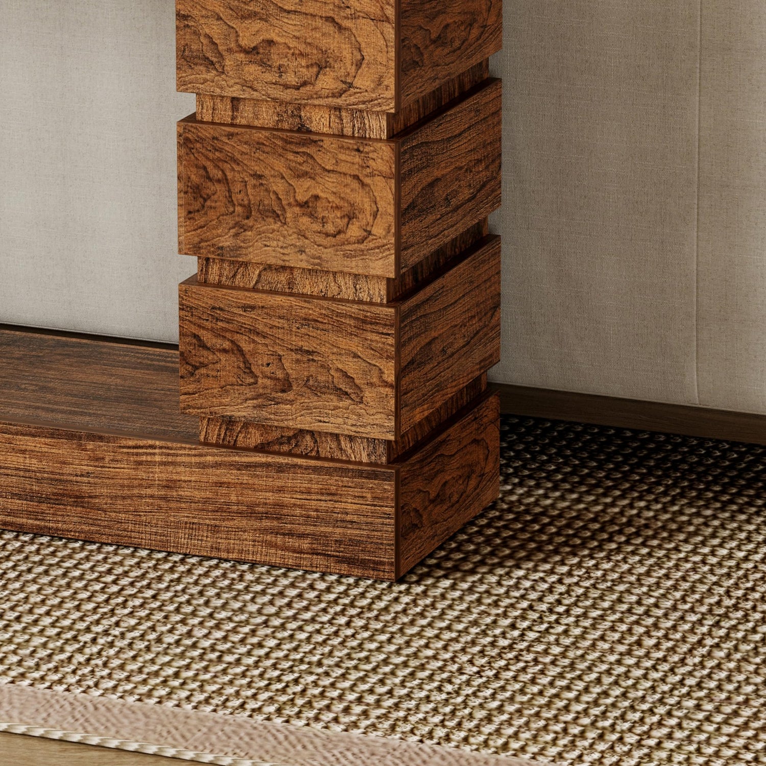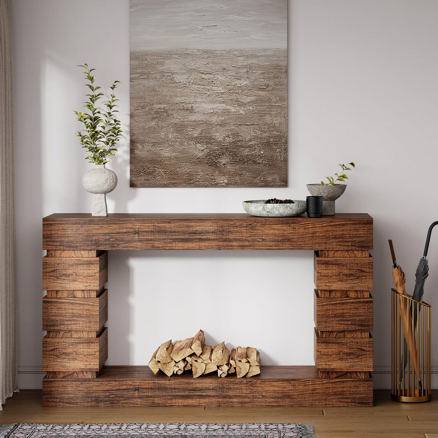 - Elegant Vintage and Rustic Style Console Table: This accent table features a design that combines geometric elements with modern lines, making it both functional and visually appealing. Crafted with warm wood tones and a vintage brown finish, it exudes a simple yet timeless charm. The clean lines and classic rustic-vintage blend create a cozy and inviting atmosphere, making it ideal for contemporary farmhouse, industrial, or eclectic home decor styles