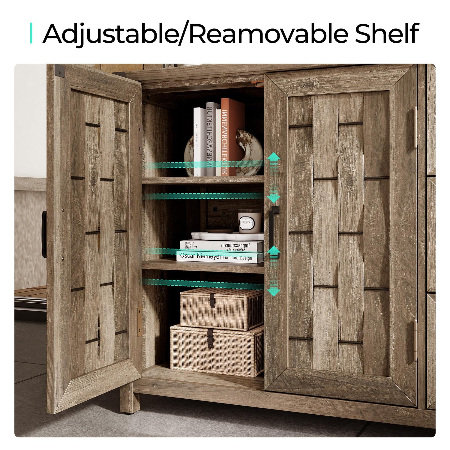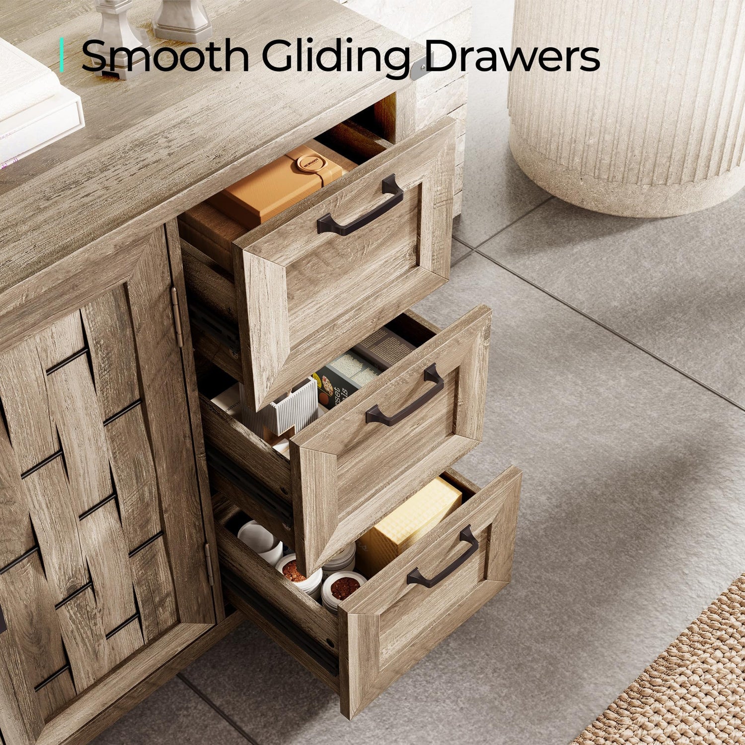 - Functional and Stylish - Comes with distinctive woven patterns, rustic wood grain finish, and iron-colored metal finishes, this buffet cabinet blends functionality and timeless farmhouse charm and adds eye-catching character to your kitchen, dining room, or living room