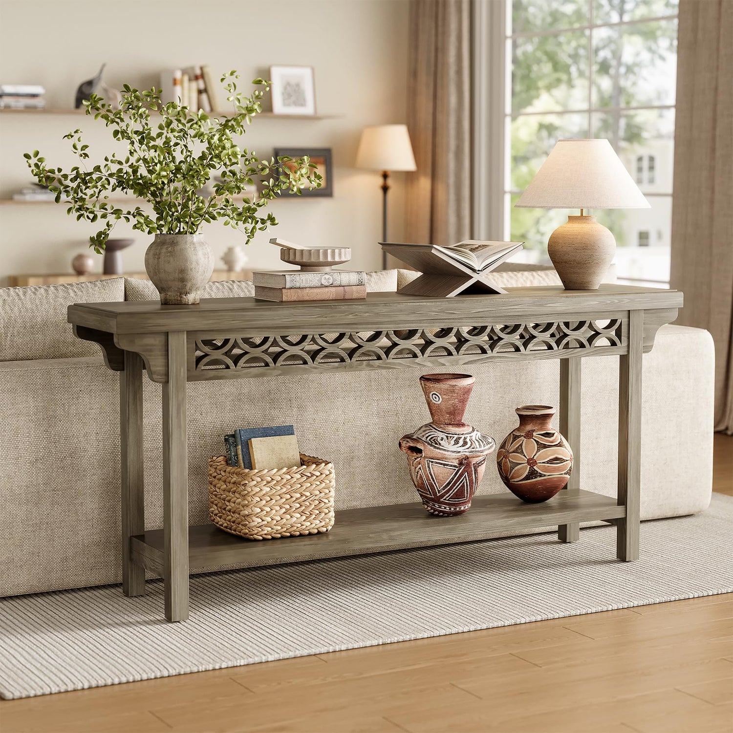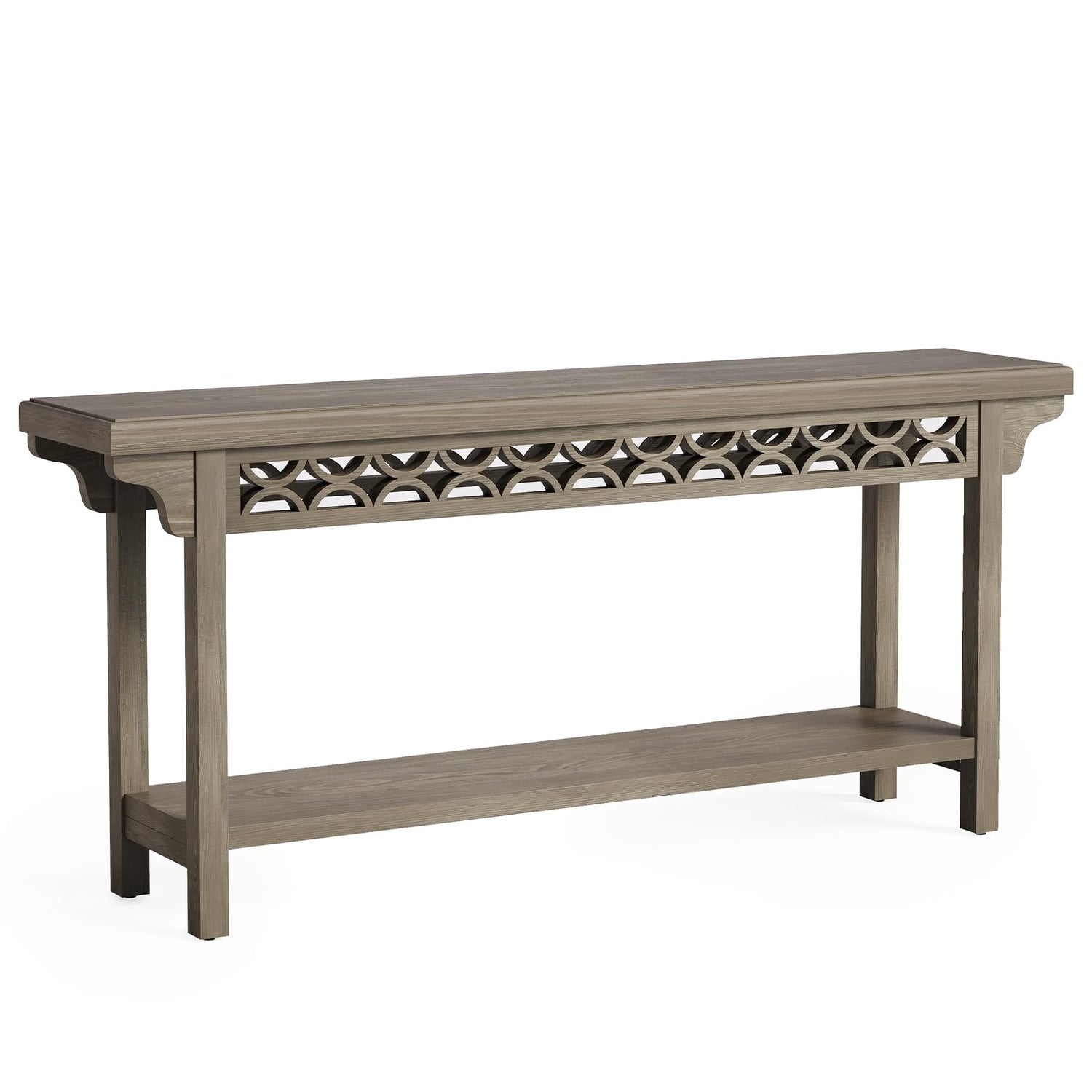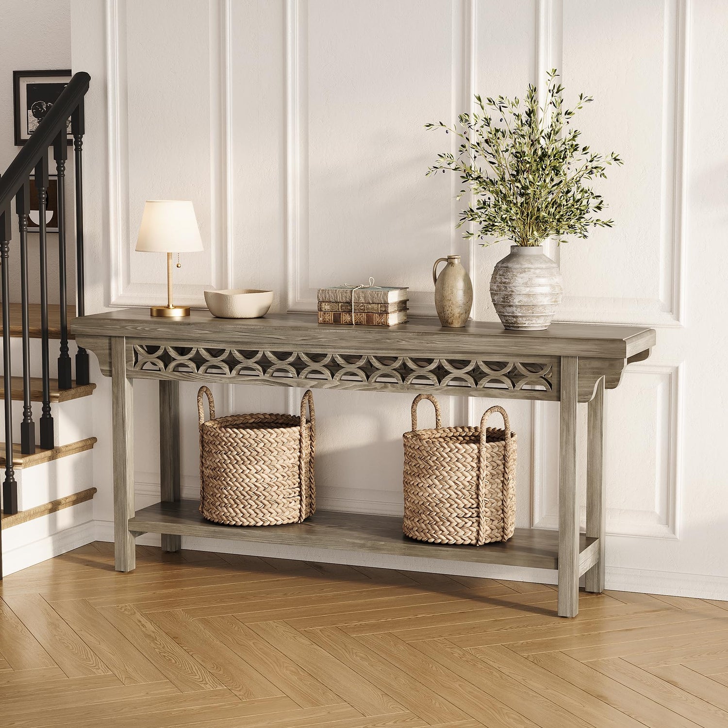• Farmhouse Aesthetics: Welcome the rustic farmhouse vibes with this long sofa table. The timeless design, inspired by modern farmhouse fashion, includes a clean-lined tabletop with a sleek gray finish