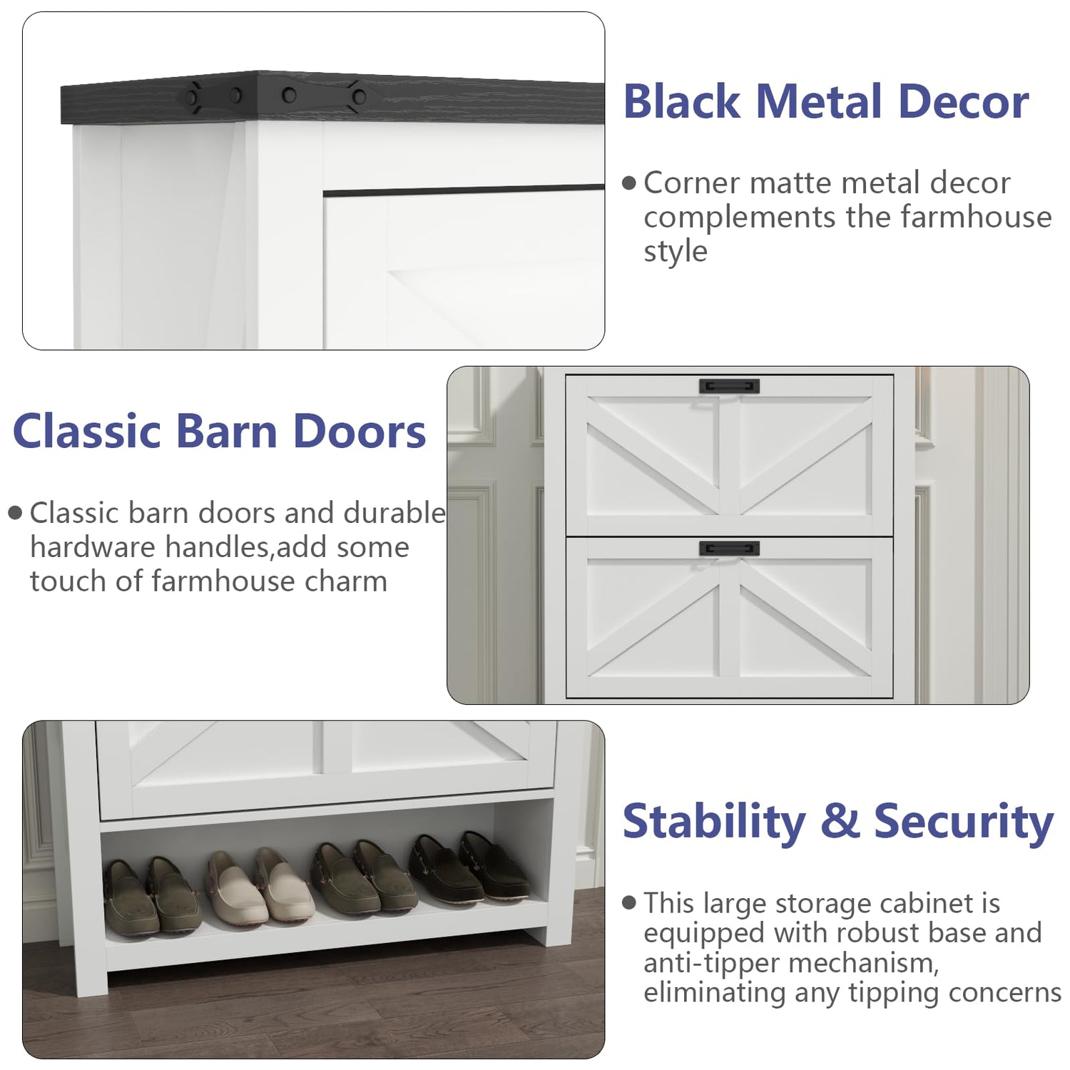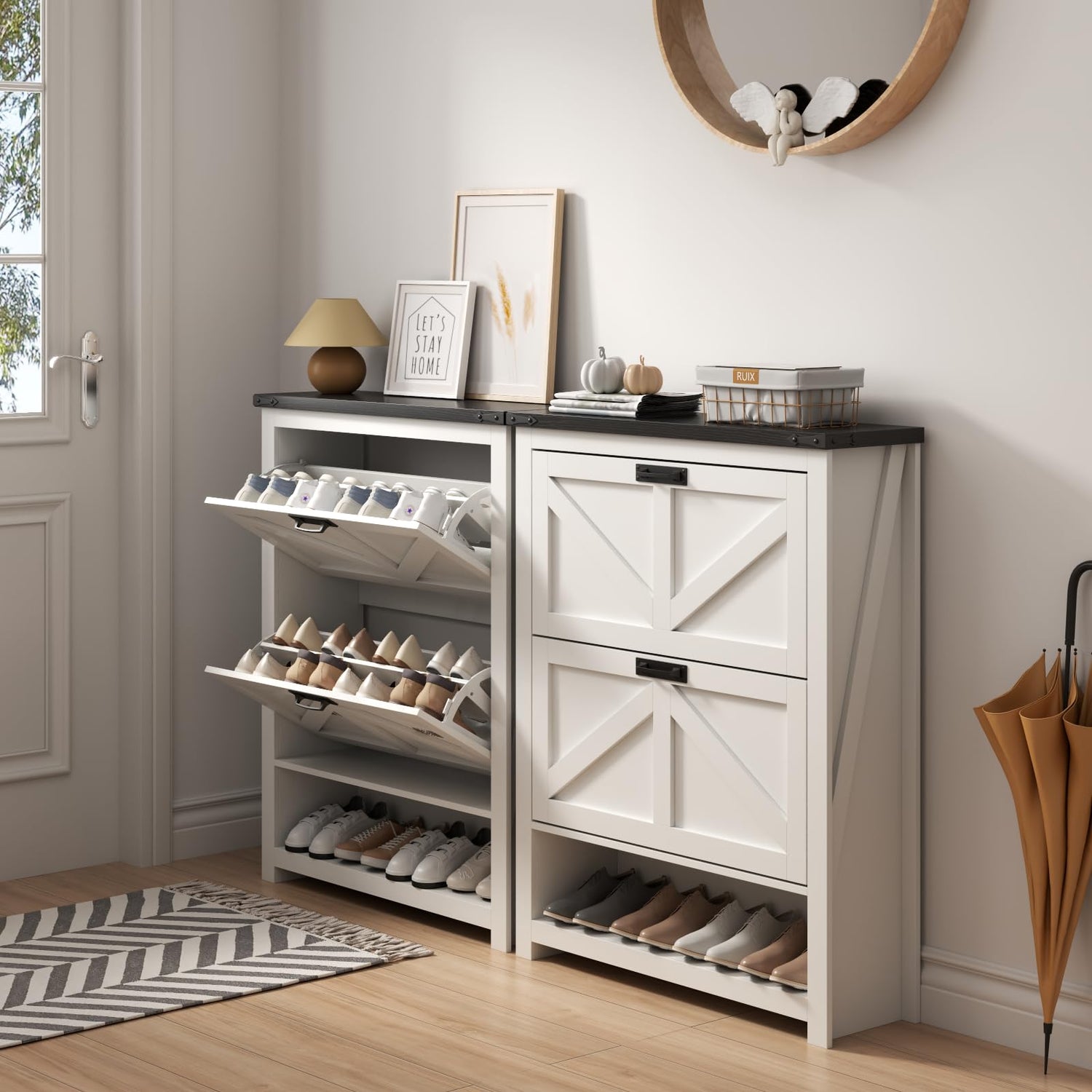 - 【Farmhouse Style】Where classic charm meets practical elegance. Embrace the timeless allure of rustic craftsmanship, finely crafted to elevate your home. Its sturdy construction ensures a reliable sanctuary for your footwear collection while exuding an authentic farmhouse touch. Designed with meticulous attention to detail, its flip drawers and compartments provide optimal organization for your shoes. Not just a storage solution, but a statement piece that seamlessly blends into your decor, adding a touch of sophistication to any entryway or bedroom. Bring home the Shoe Cabinet, where functionality meets exquisite design. Elevate your home with this ode to classic style and practicality.