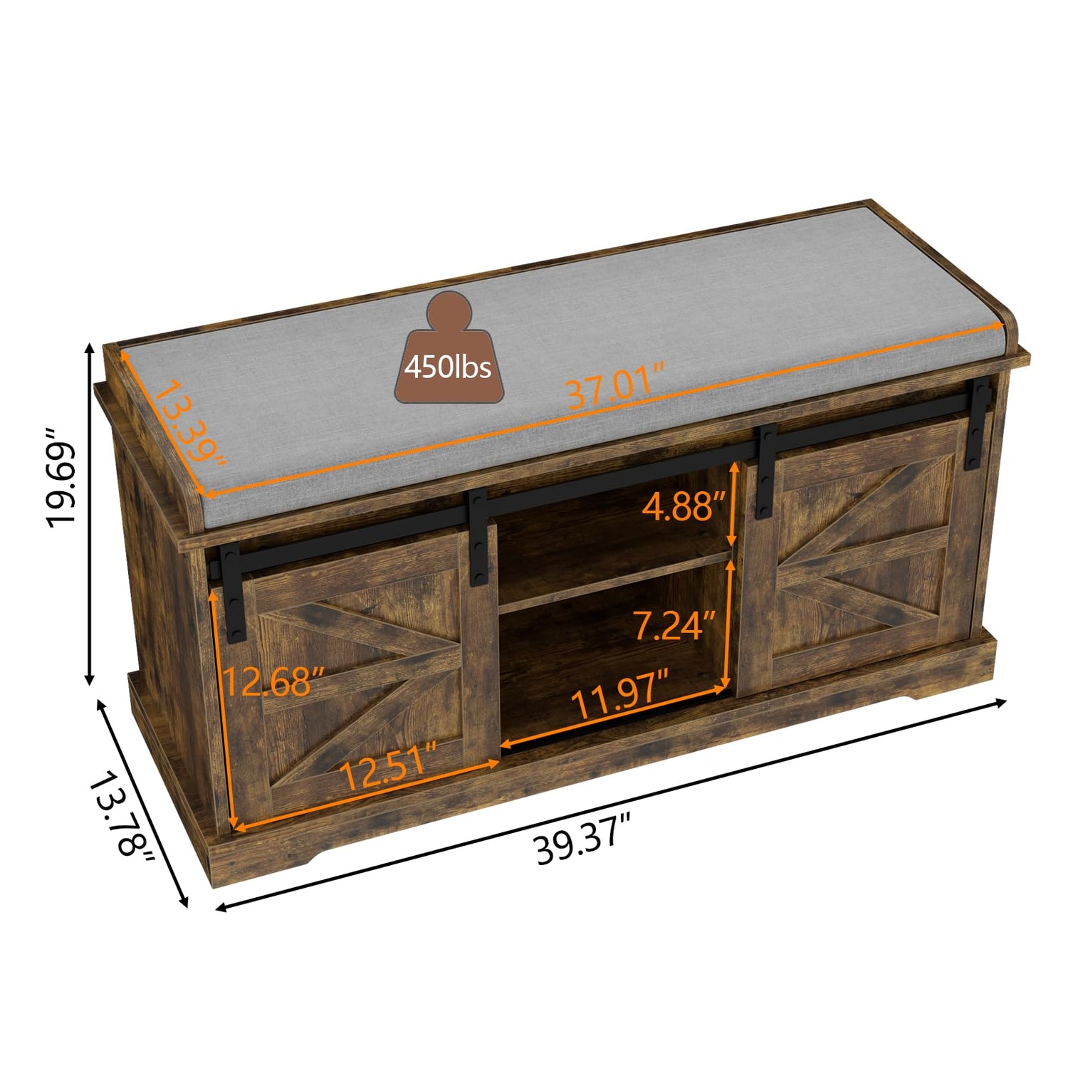 Loomie Shoe Storage Bench, 2-Tier Farmhouse Entryway Bench with Sliding Barn Door Storage Cabinets & Full Soft Removable Seat Cushion, Silm Shoe Rack with Shoe Cabinet for Entryway, Hallway, Bedroom