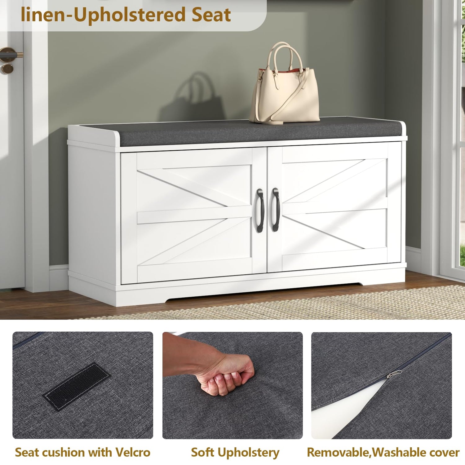 - [Perfect Shoe Bench Solution] This 2-tier shoe storage bench, designed with a charming farmhouse aesthetic, seamlessly merges functionality with beauty. No longer will you need to worry about scattered footwear throughout your home. Bid farewell to the cumbersome act of bending over when donning your shoes.Its multifunctional design provides a comfortable seating area for changing shoes, while offering ample storage capacity to accommodate a diverse array of footwear with elegance.This shoe bench optimizes spatial efficiency, making it an ideal solution for effortlessly changing shoes and maintaining a tidy environment, ensuring that your entryway remains a welcoming and orderly space.