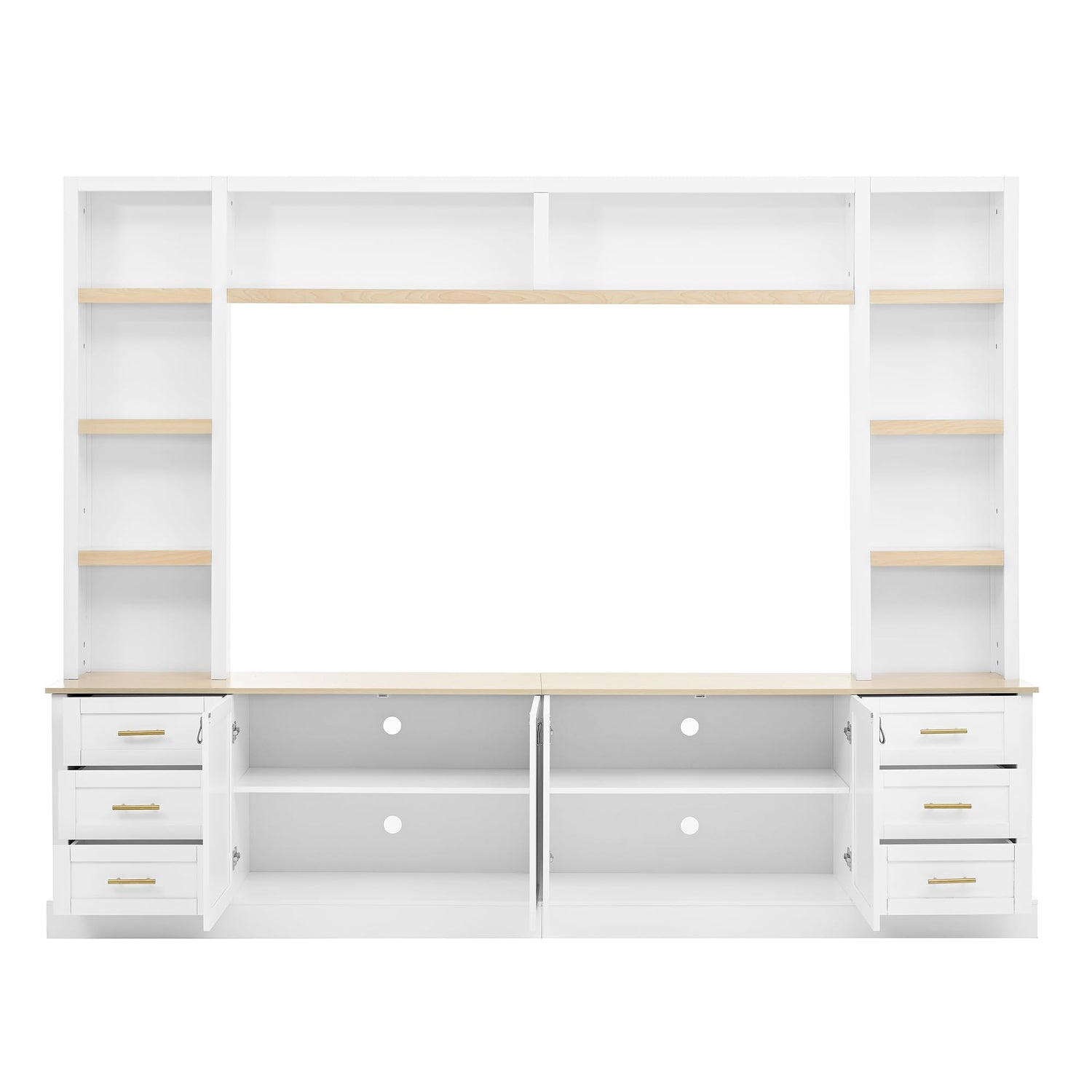 - [Versatile Storage Space]: This wall entertainment unit features 6 drawers, open shelves and 2 cabinets. Includes 2 adjustable shelves in cabinets. Simply align the shelves with the pre-drilled holes to customize your storage space. Easily accommodate various electronic devices and display collectibles.