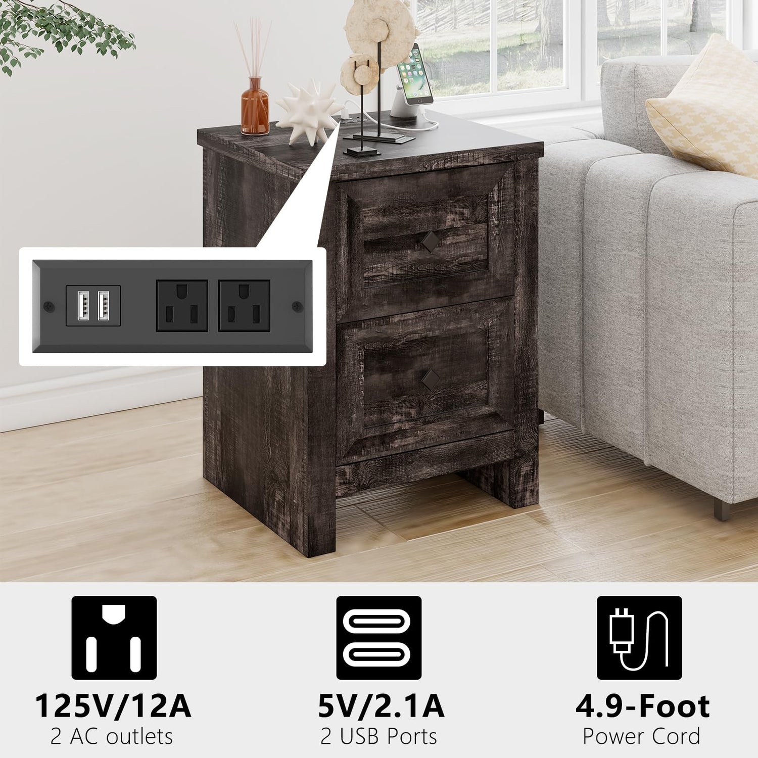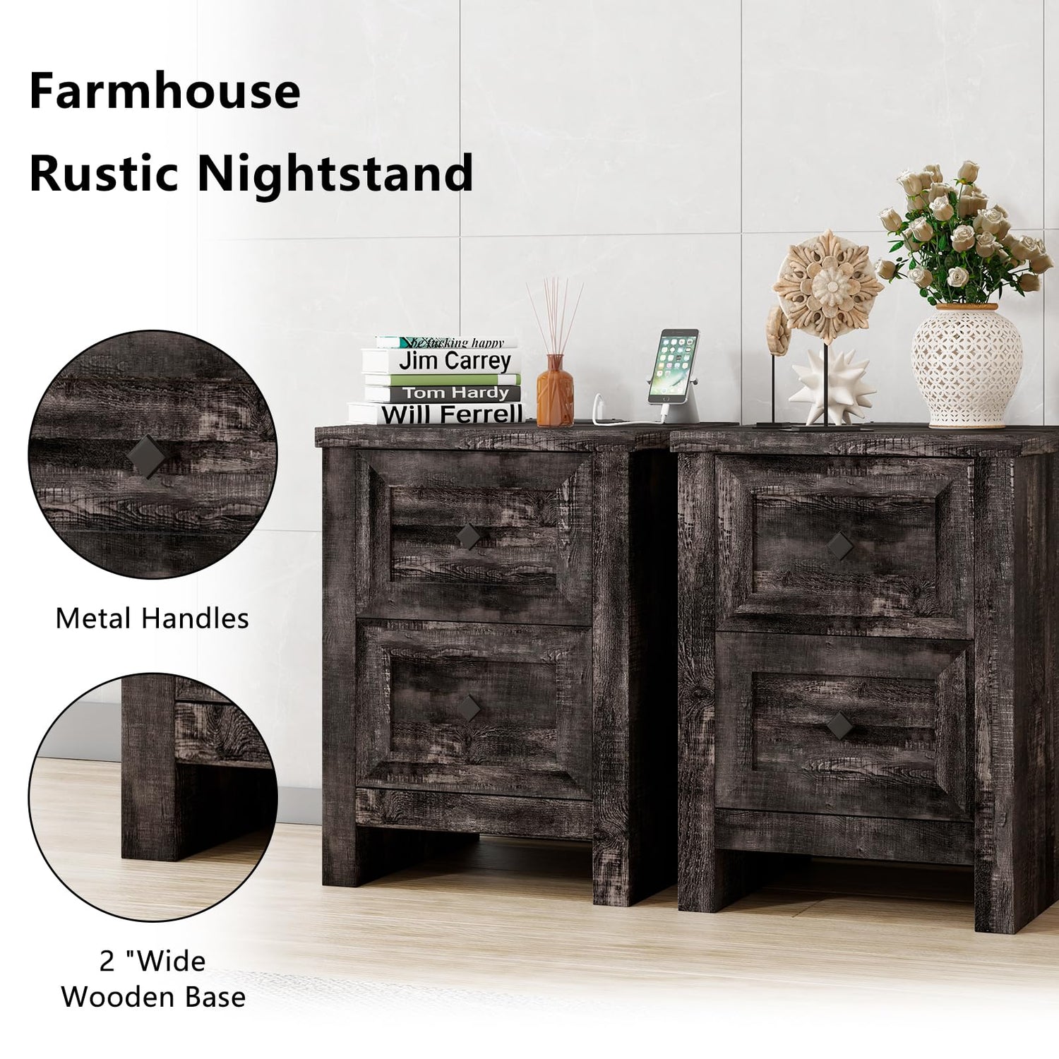 LUXOAK Nightstand Set of 2 with Charging Station, Farmhouse End Table with 2 Drawers Storage Cabinet, Rustic Wood Sofa Side Table for Bedroom, Living Room, Office, Dark Rustic Oak