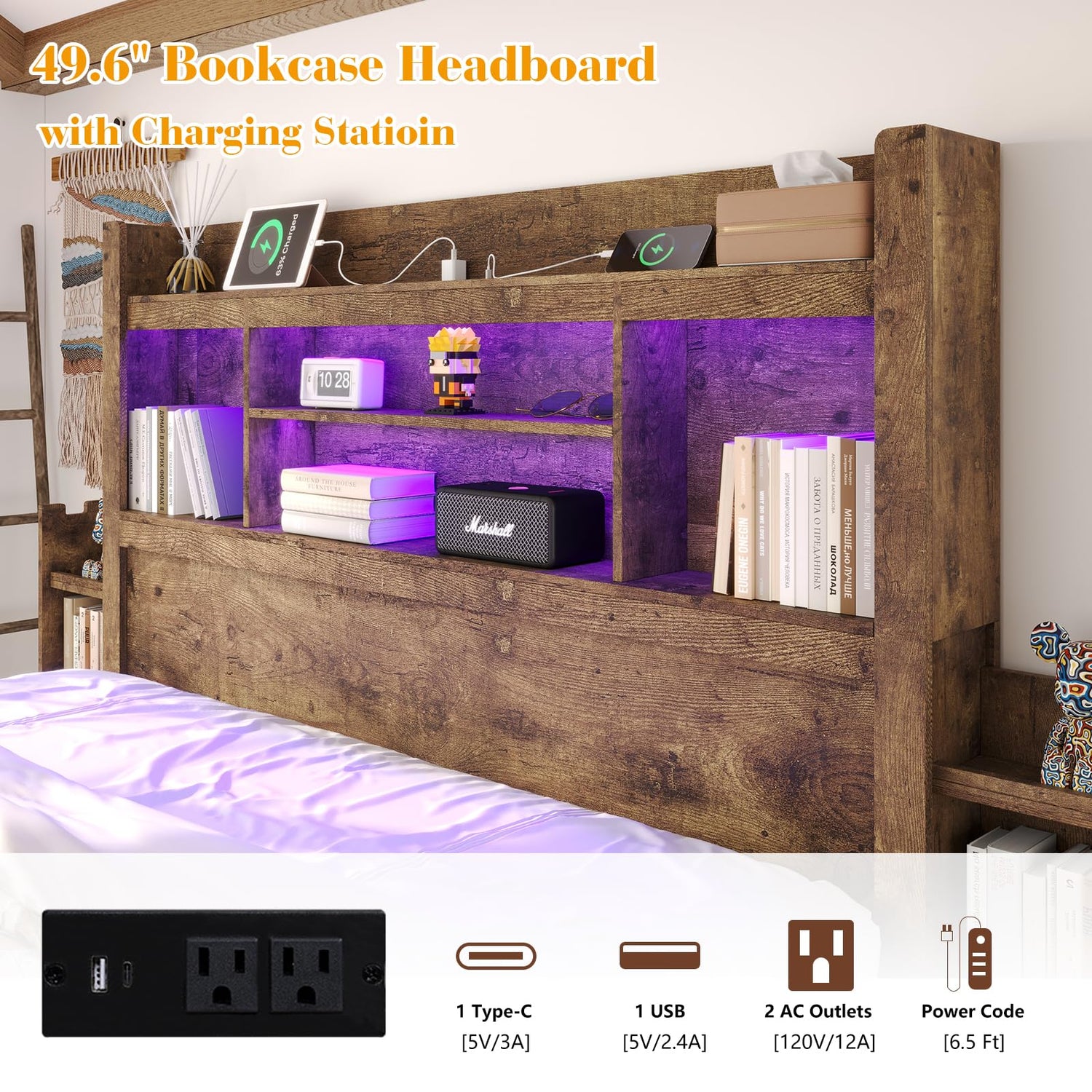 - 【Bookcase Headboard & Charging】49.6" storage headboard offers varying shelf heights to accommodate a range of items. Equipped with Type-C, USB, and 2 outlets, this headboard keeps your devices charged and within reach.