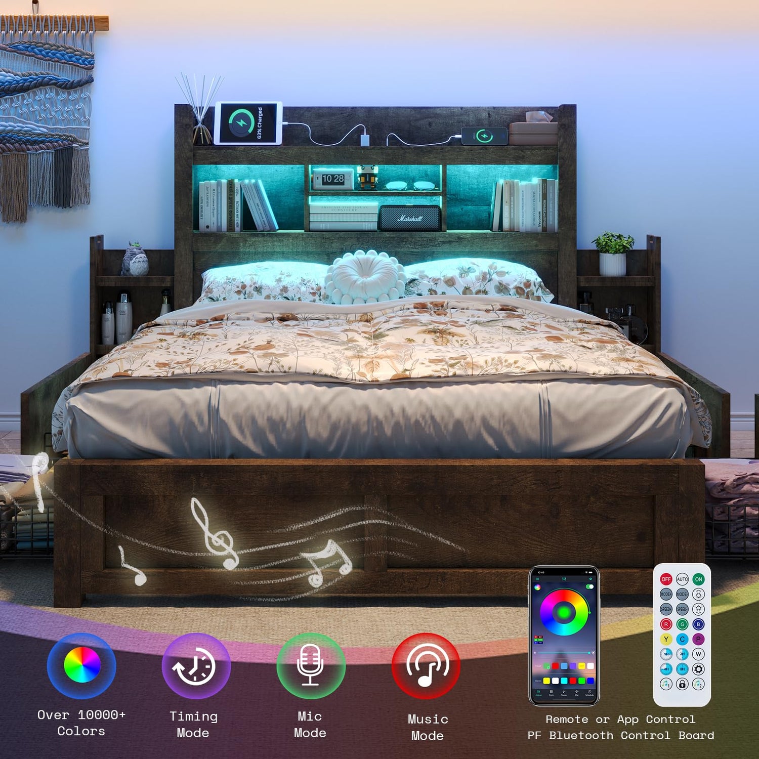 - 【Elegant Wood Grain & RGB LED】Bed Frame features panel-style design with no exposed metal, complemented by a sophisticated wood grain and RGB LED lights can be controlled via a remote or App, offering 1000+ color options for customizable ambiance.