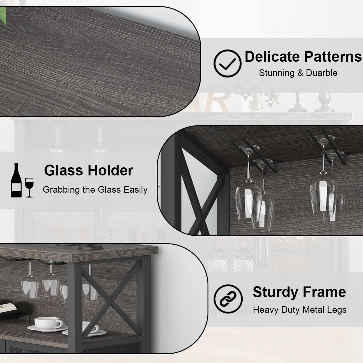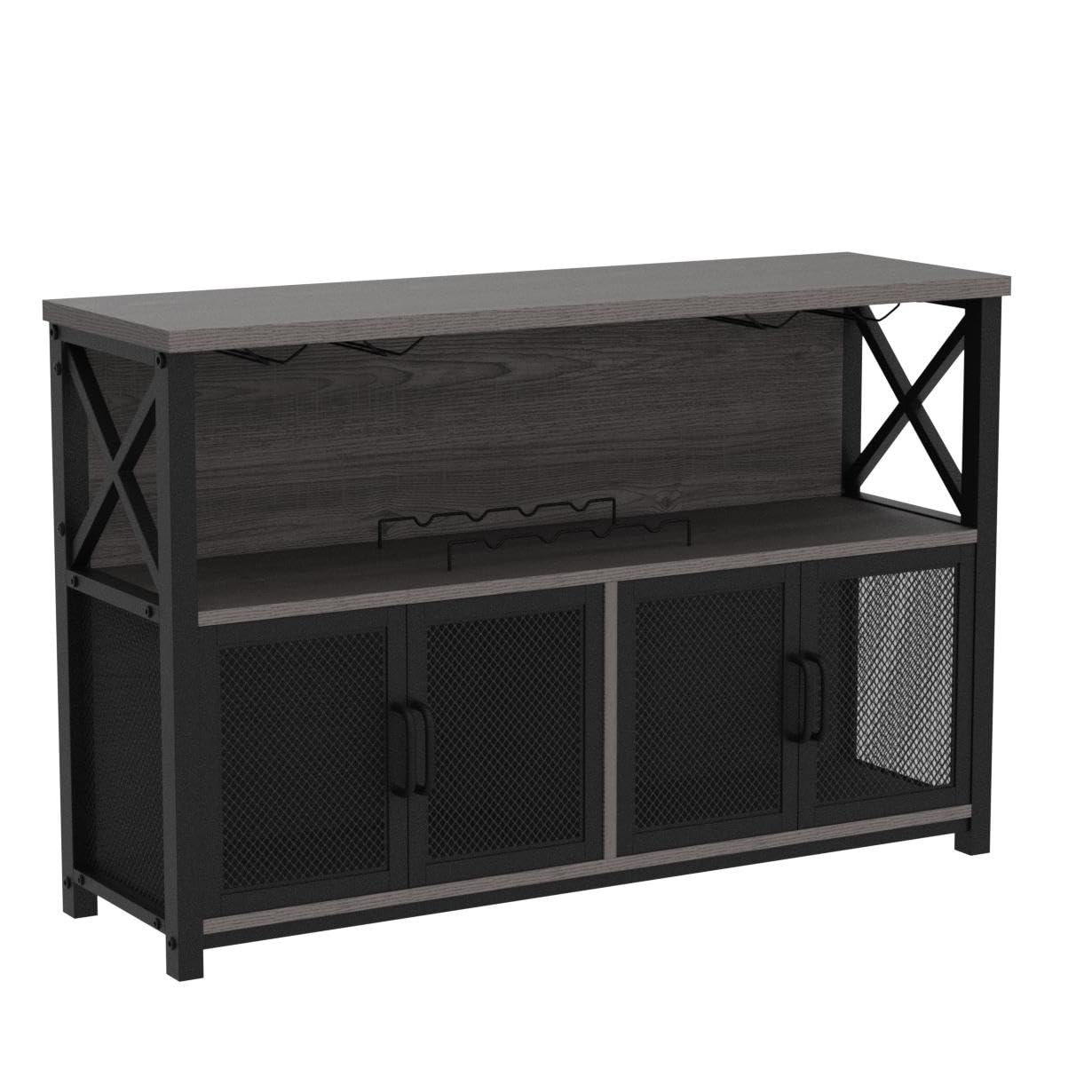 LVB Industrial Dark Gray Oak Wine Bar Cabinet with Storage Rack and Glass Holders