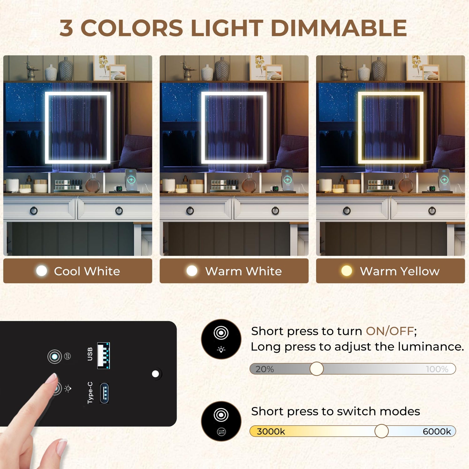 - 3-Color LED Light and Charging Station: Our 4D high definition mirror features adjustable cool/natural/warm lighting with dimmable brightness – perfect for precise makeup, skincare, and styling. Built-in USB charging ports keep devices powered and cords neatly contained