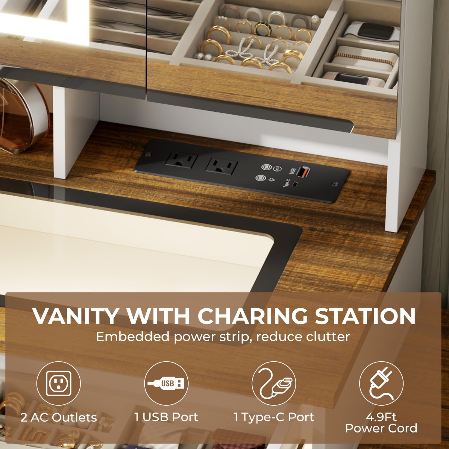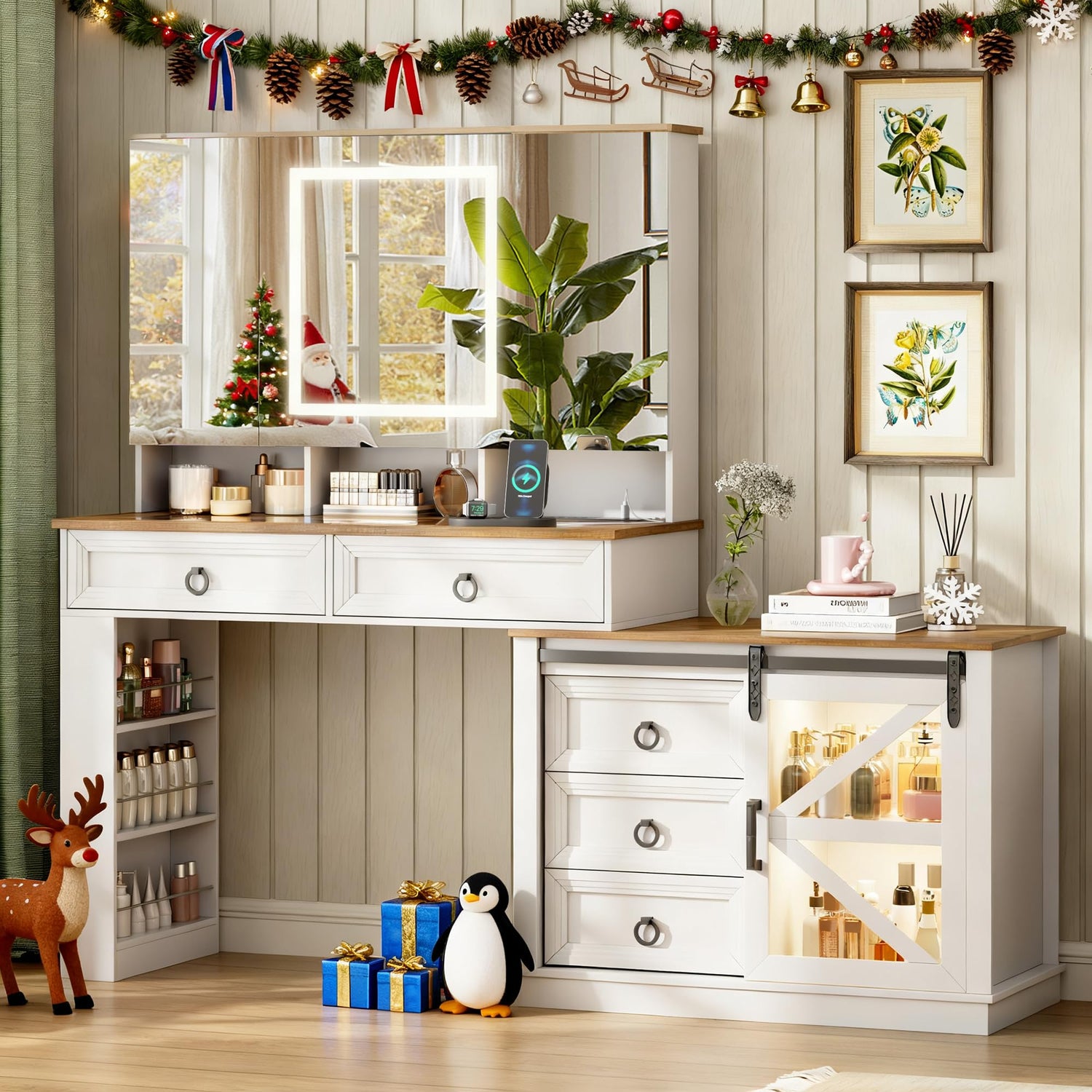 - Unique Farmhouse Style: Embrace rustic elegance with classic brown woodgrain and white finish. This makeup vanity equipped with a clear glass desktop, rivet detailing and arrow-shaped design add unique character. FSC-Certified wood for exceptional scratch-resistance and long-lasting sturdiness