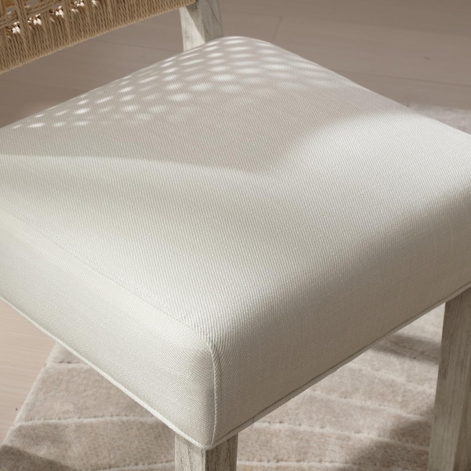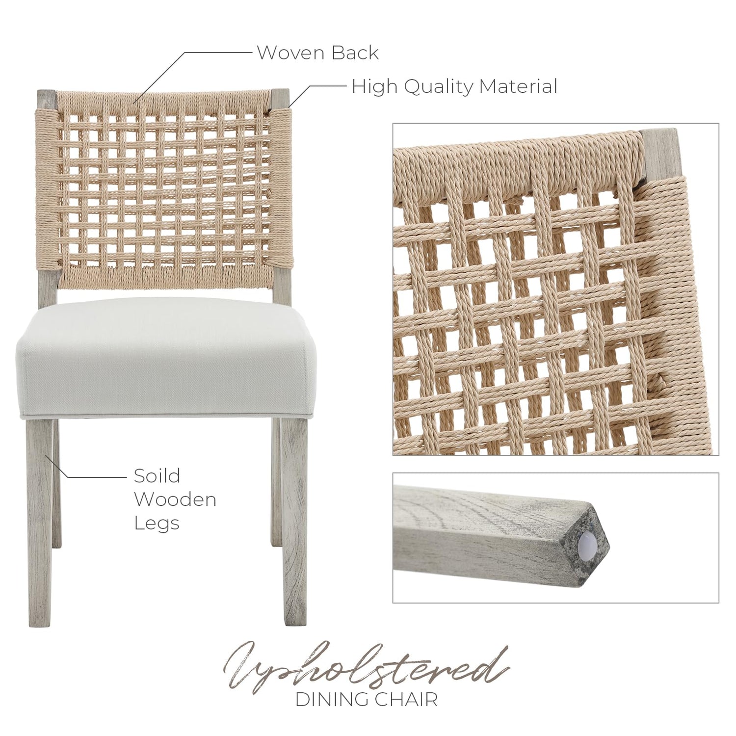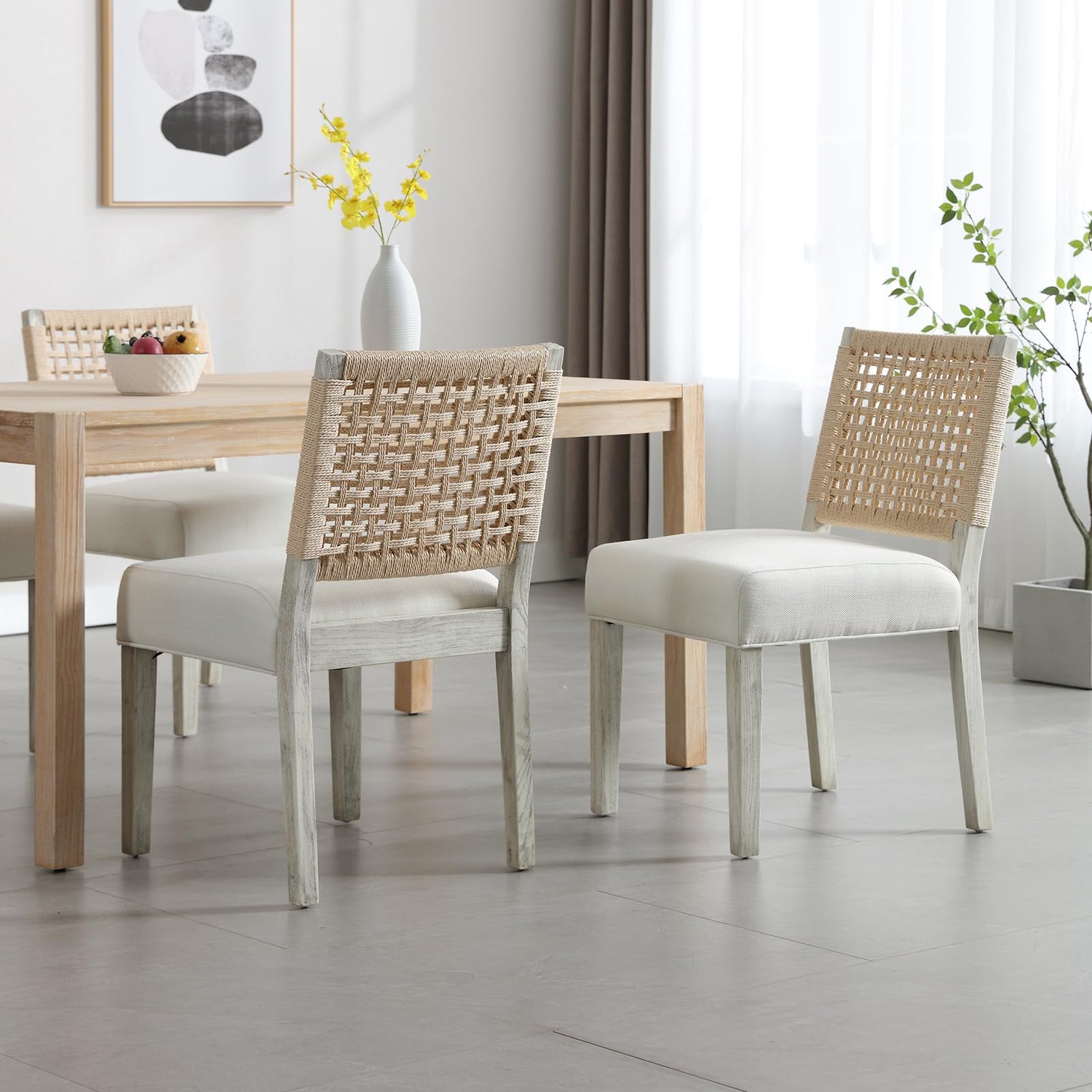 LZAREAL Farmhouse Dining Chairs Set of 4 Linen Fabric Upholstered Accent Side Chair, Mid Century Modern Kitchen & Dining Room Chairs with Woven Rope Back for Home, Living Room, Bedroom - White