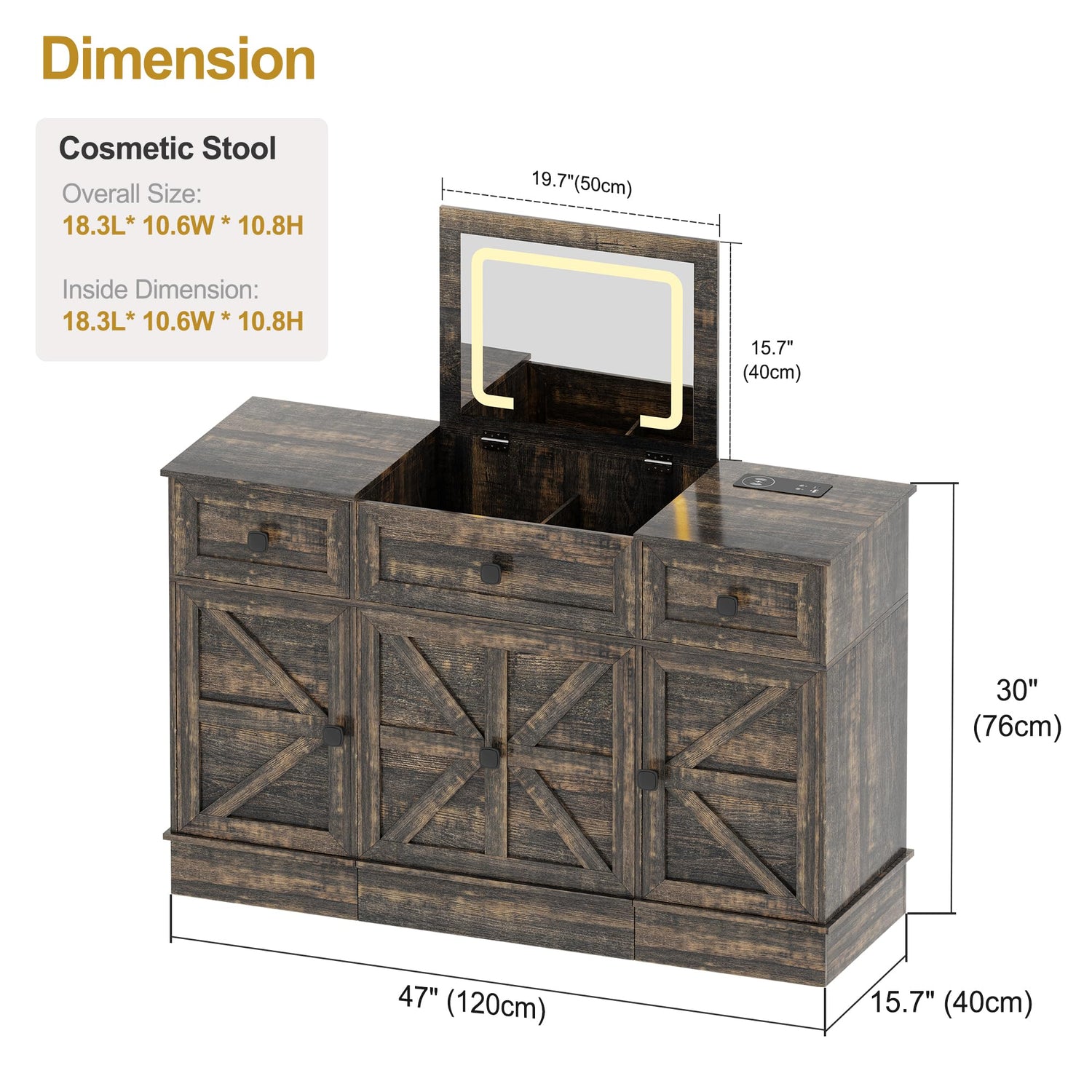 MDGC 3 in 1 Vanity Desk with Mirror and Lights, Farmhouse Dressing Table with Charging Station, Compact Makeup Vanity Table with 3 Drawers & Hidden Storage Stool (Rustic Brown)