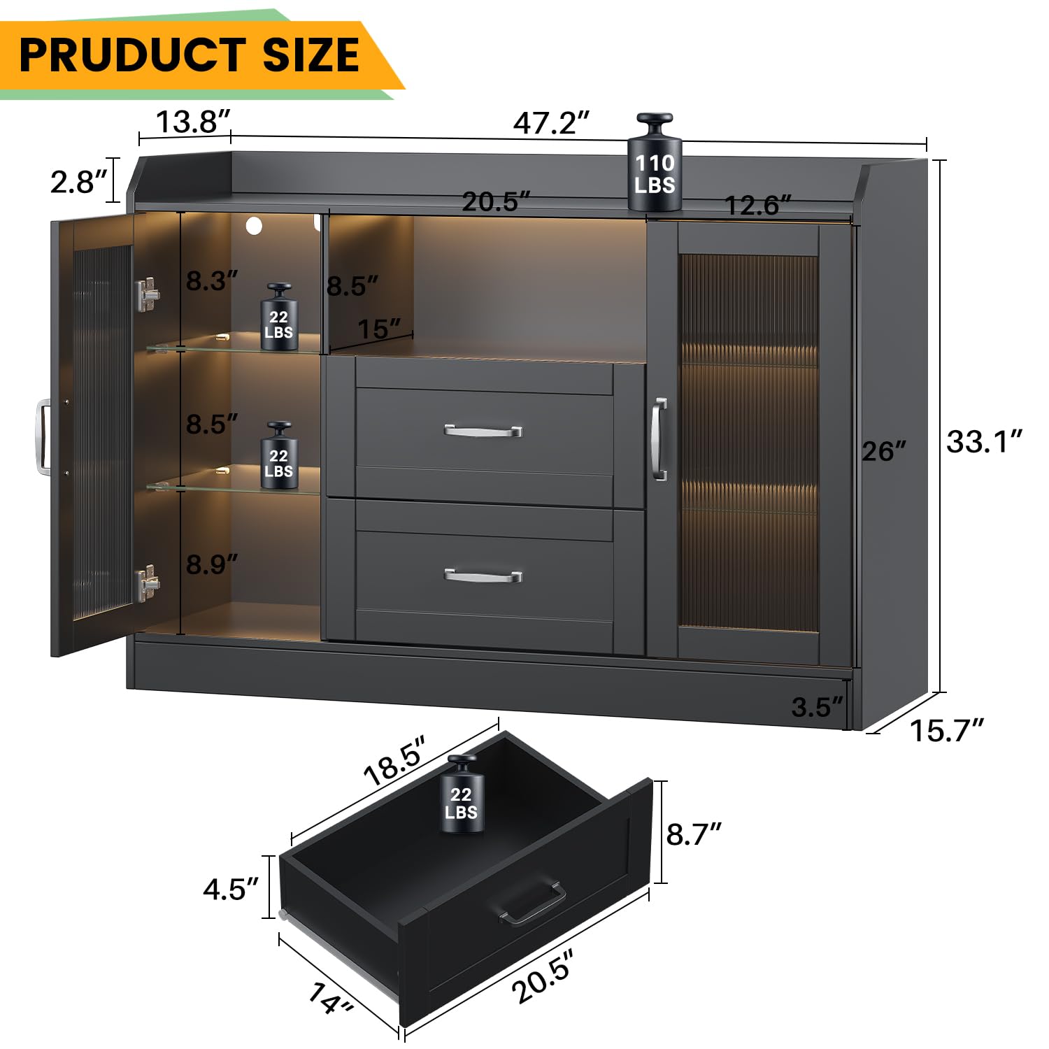 Melodyblue Buffet Cabinet, 48" Farmhouse Sideboard Buffet Storage Cabinet with Led Lights, Versatile Glass Doors, Sturdy MDF Construction, Coffee Bar Cabinet for Dining Room (Black)