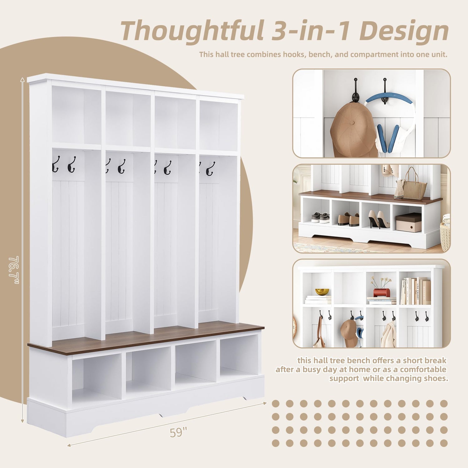 - đ˛ăMultifunctional DesignăThe 3-in-1 design integrates seating, hooks, open storage space, significantly enhancing the functionality of this hall tree. Whether it's serving as a temporary stool for hanging up hats and bags upon entering, or accommodating different items that need to be displayed or stored, this versatile hall tree easily accommodates all, keeping your entrance area neat and orderly