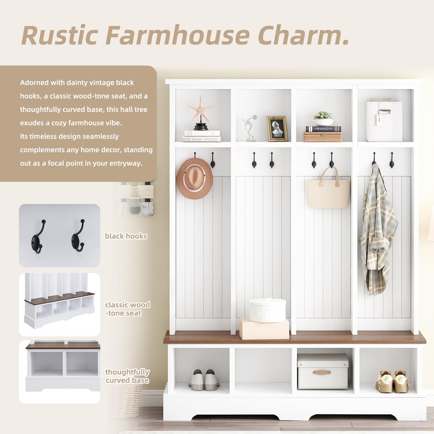 - đ˛ăFarmhouse Hall TreeăAdorned with dainty vintage black hooks, a classic wood-tone seat, and a thoughtfully curved base, this hall tree exudes a cozy farmhouse vibe. Its timeless design seamlessly complements any home decor, standing out as a focal point in your entryway