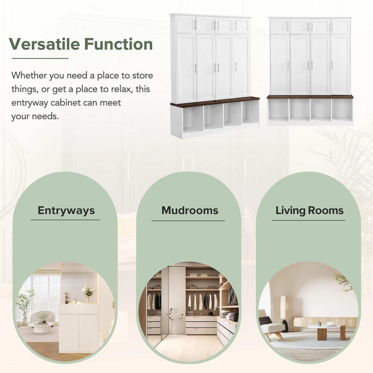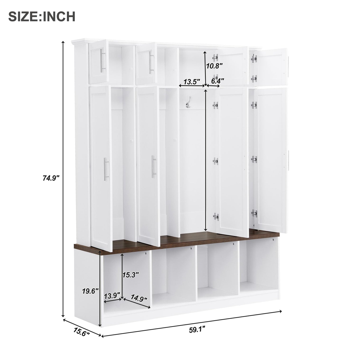 - 3-in-1 Design: This hall tree includes a bench, 8 cabinets and 4 storage shelves, becoming an excellent organize solution for entrance. Provides seating, hanging and storage capabilities.