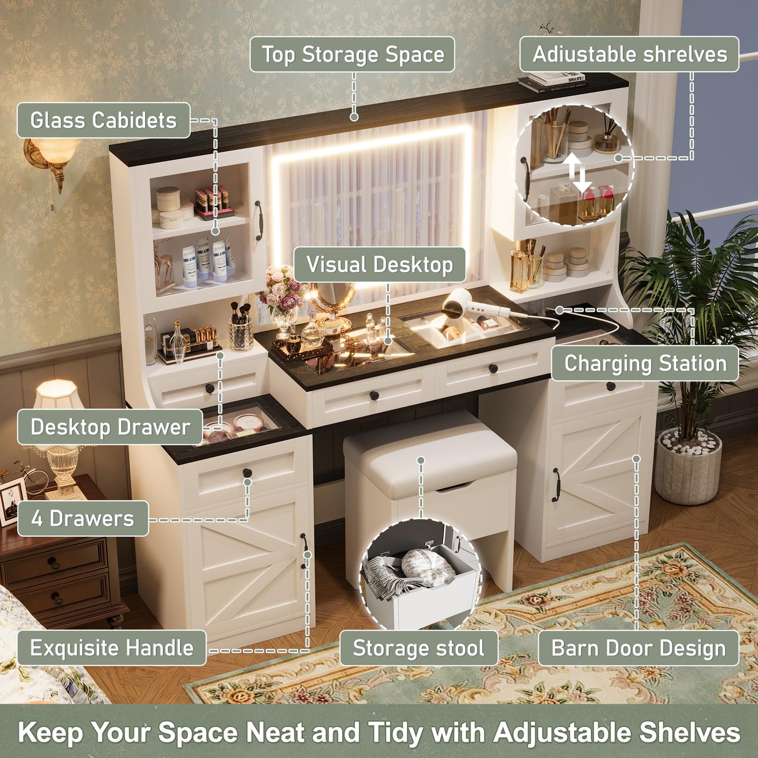 • [Ample Storage Capacity] Equipped with 5 drawers and 4 storage cabinets, this makeup vanity desk is convenient for you to sort and organize. 2 shelves with glass doors prevent items from dust and falling, the adjustable shelf accommodates items of various heights. Multiple drawers can be classified to store cosmetics, skin care products, jewelry, etc. The wider tabletop provides space for your frequently used makeup items.