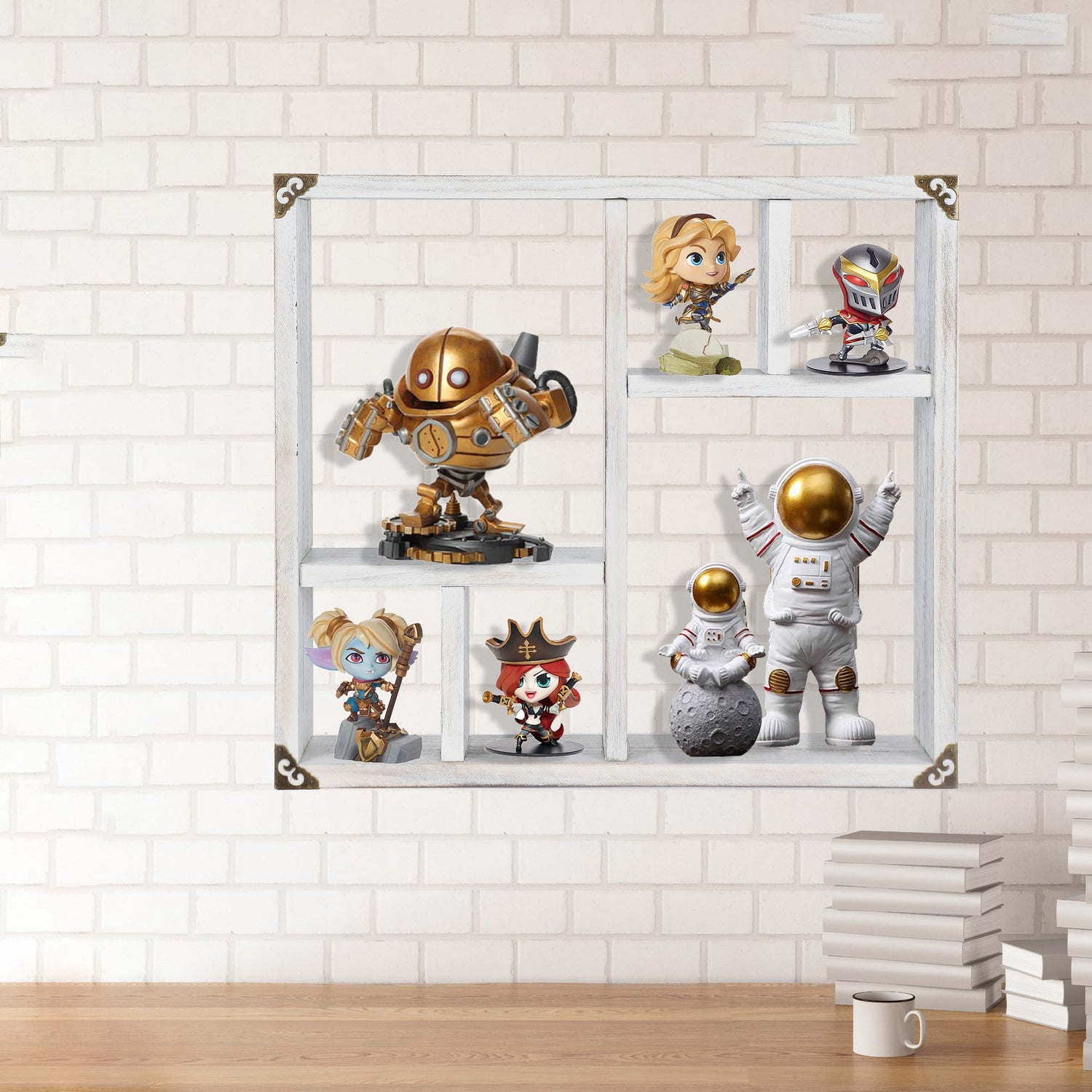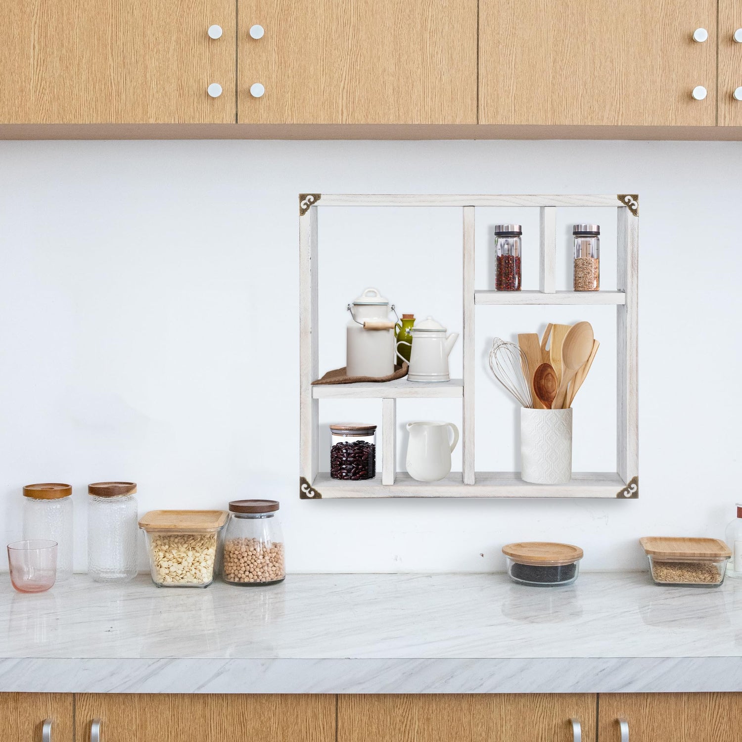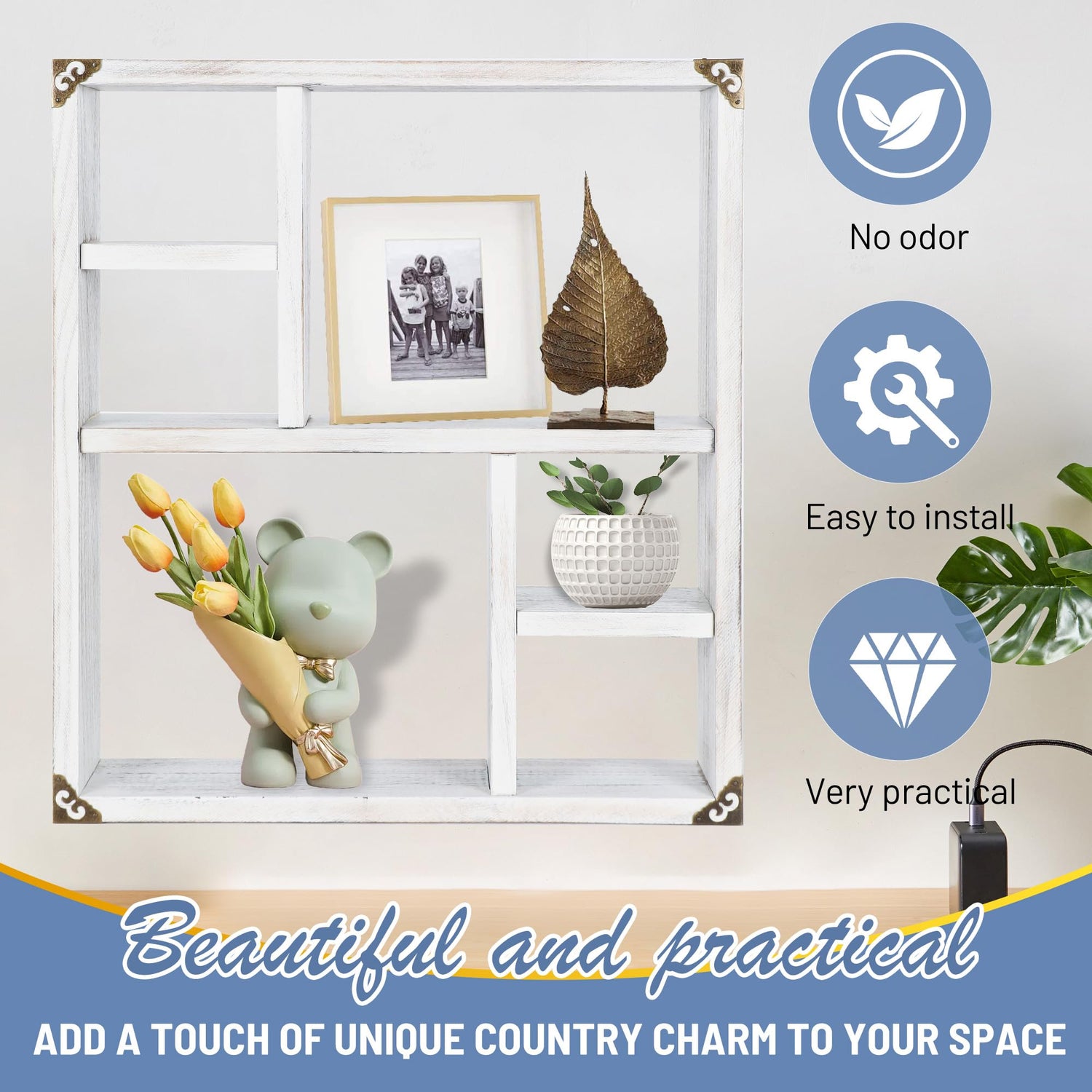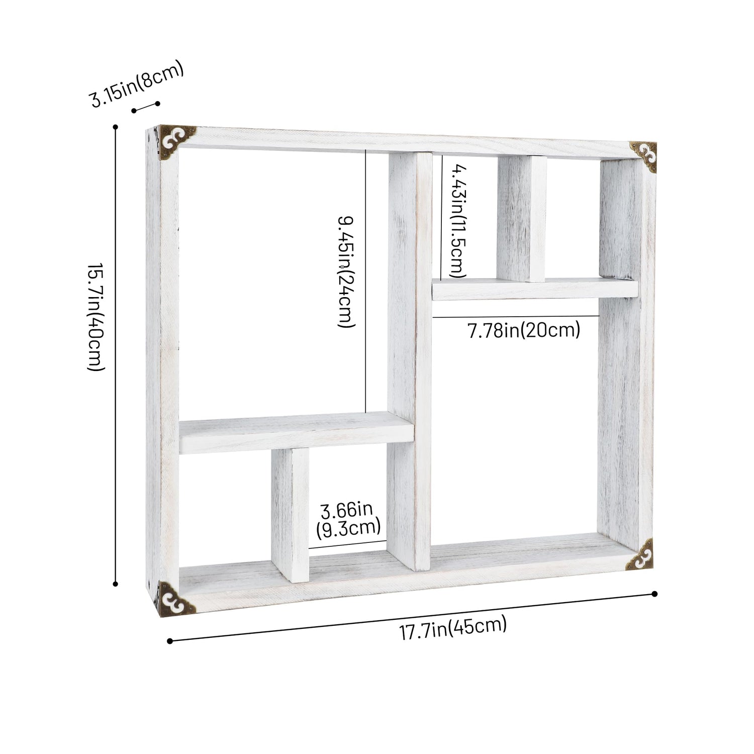 MITREL 17.7x15.7-Inch Shadow Box Display Shelf,6-Slot Rustic Floating Shelves,Larger Wood Trinket Shelf Freestanding Farmhouse Curio Shelf(6C-Rustic White)
