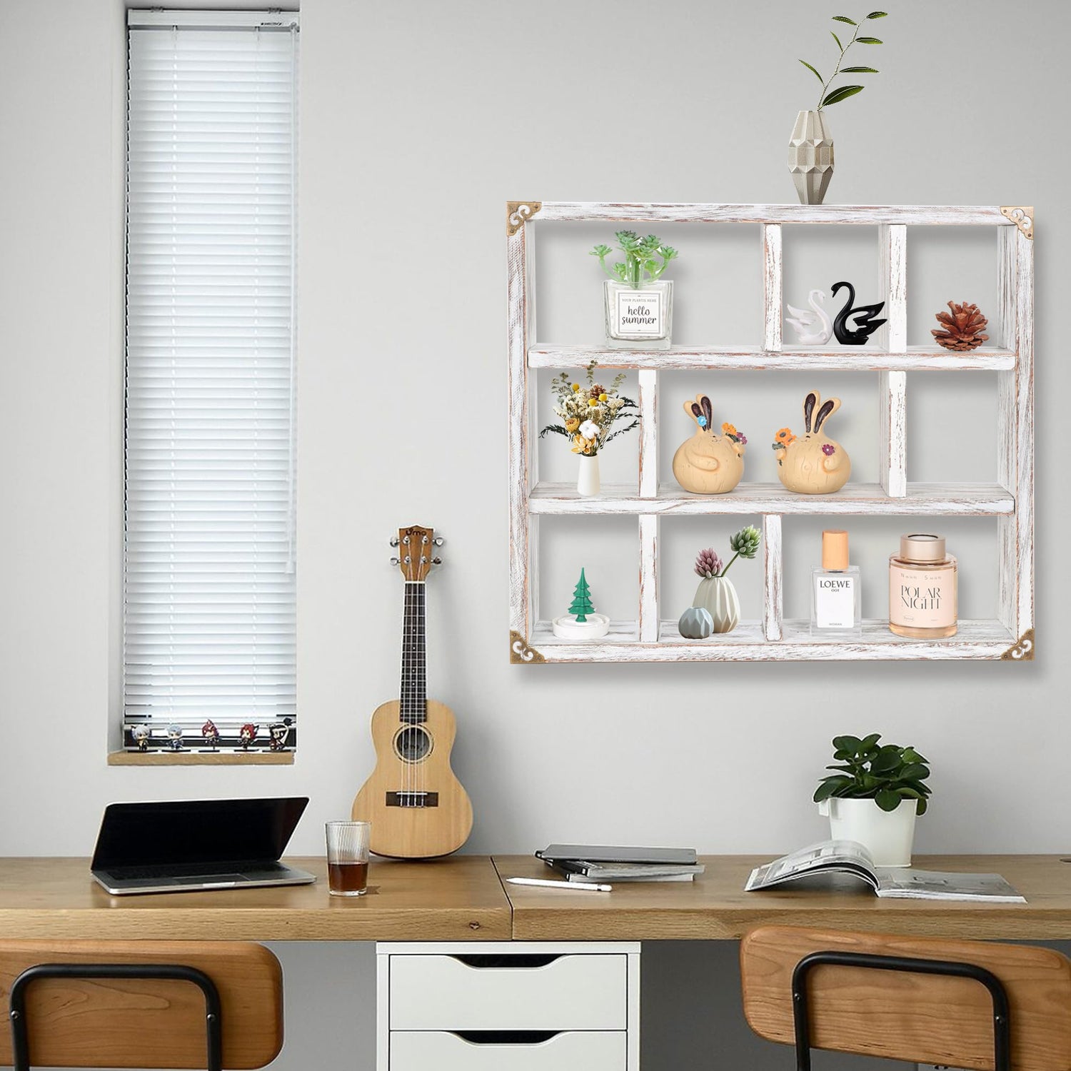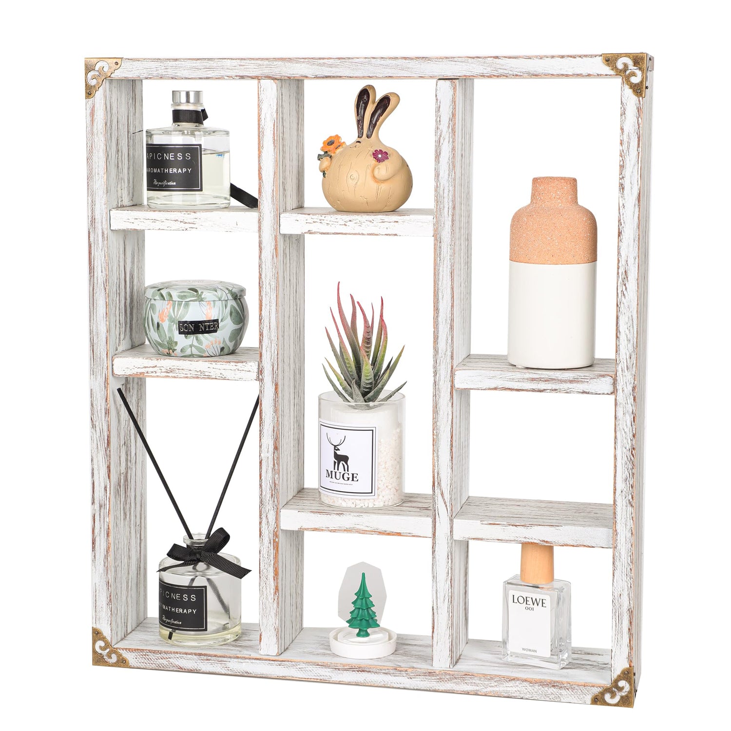 MITREL 17.7x15.7-Inch Shadow Box Shelf 9-Slot Rustic Floating Shelves Larger Wall Mounted Shelf Lightweight Solid Wood Display Shelf Freestanding Farmhouse(9C-Rustic White)