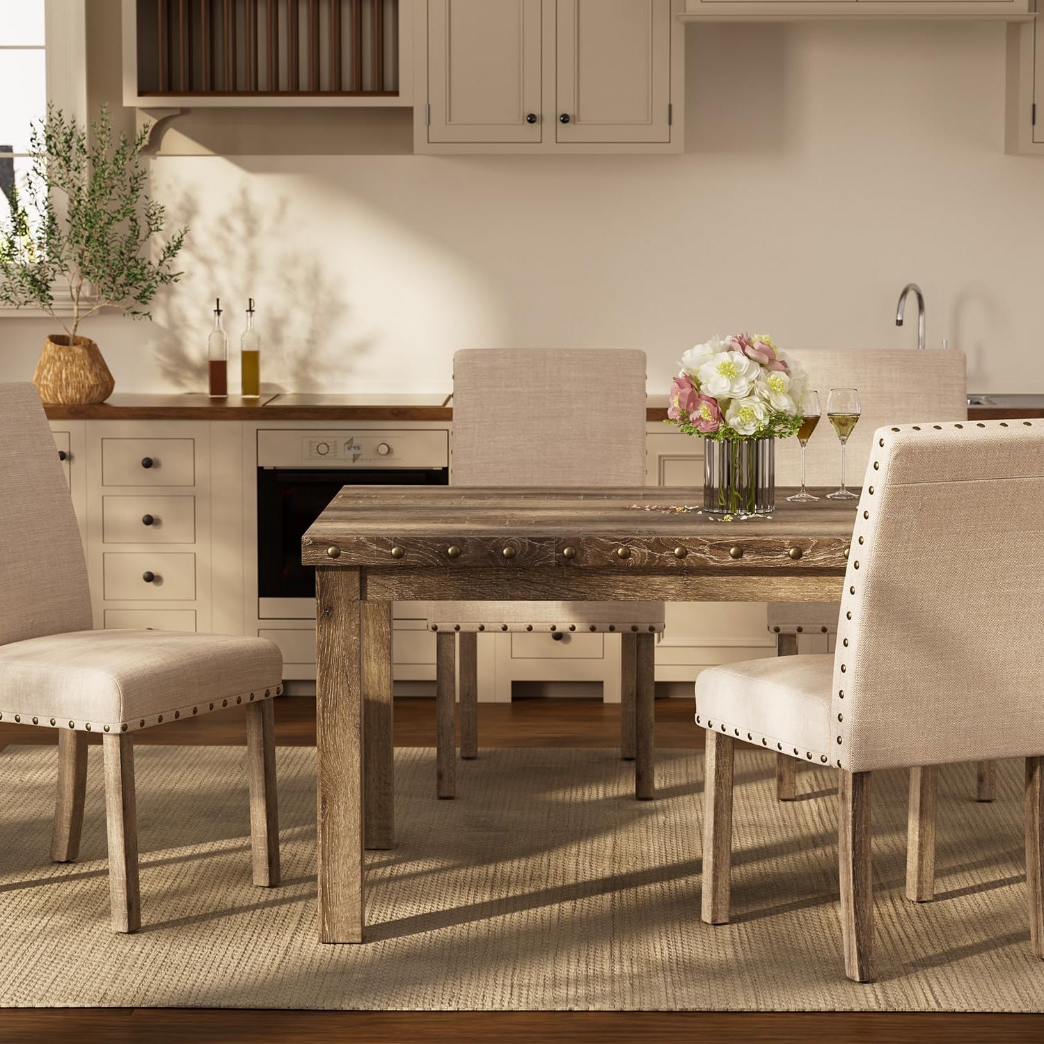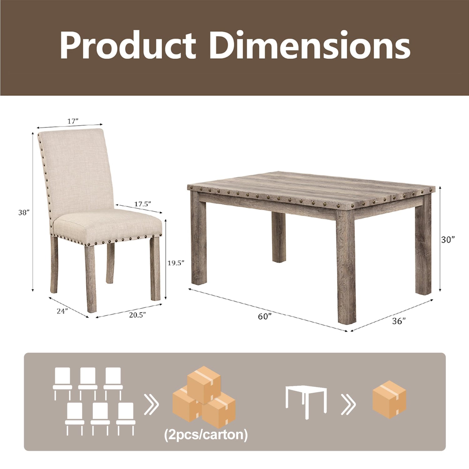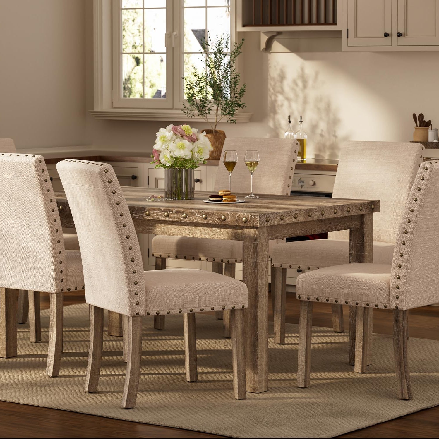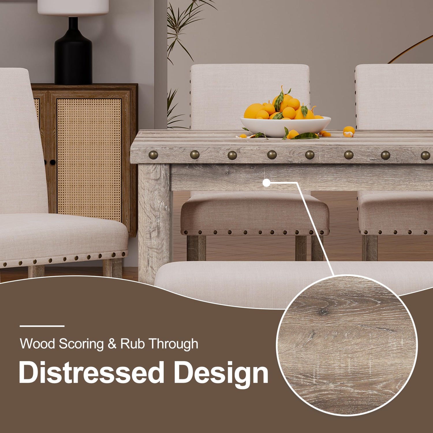 Morden Fort Rustic Dining Table Set for 6, Farmhouse Kitchen Dining Chairs for 6, Charming 60" Rectangular Wooden Table&6 Upholstered Chair with Nailhead Accents for Dining Hub,Breakfast Nook