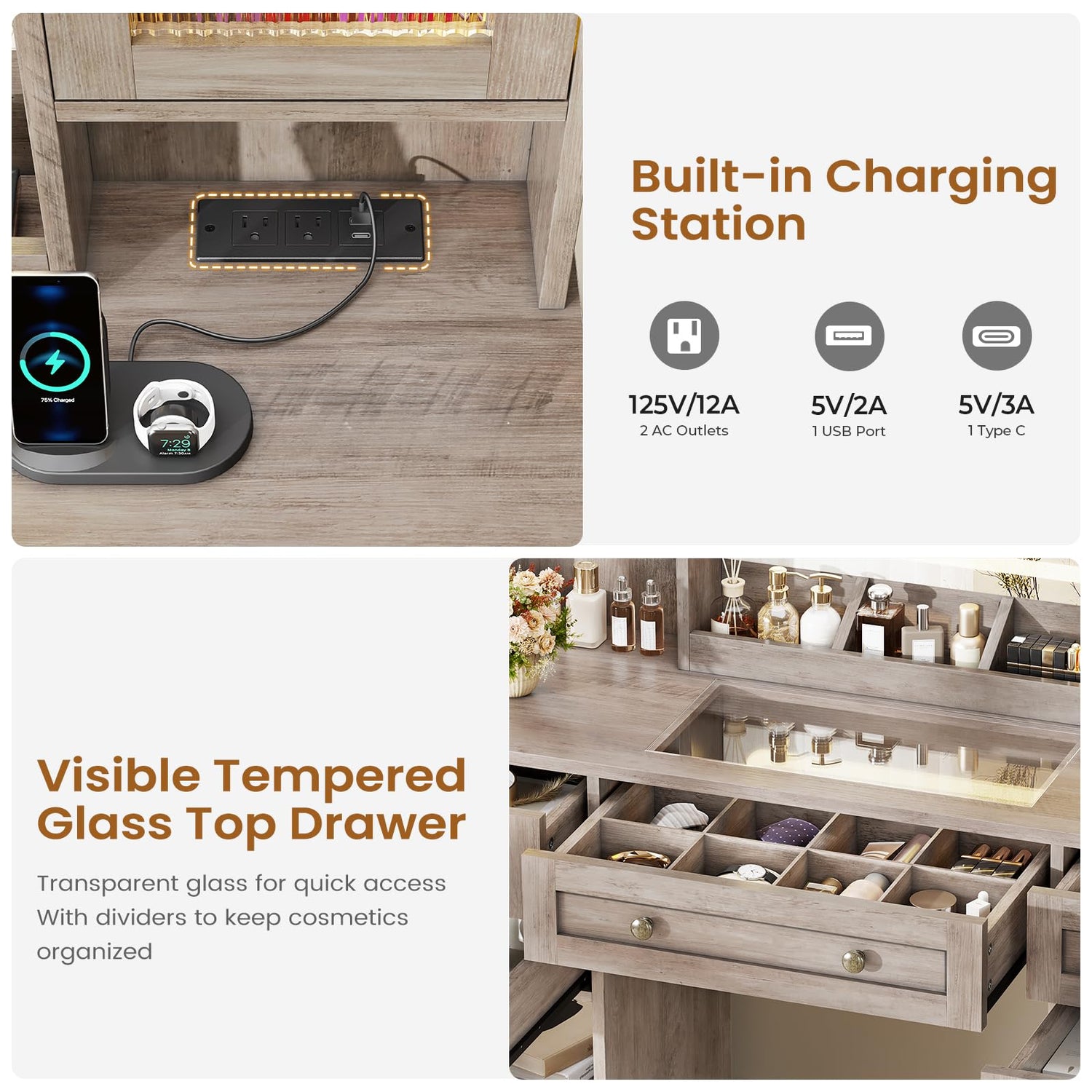 - [Vanity Desk with Charging Station] Built-in charging stations on the right side of the vanity's desktable allow you to multitask. For example, you can charge your phone while applying makeup or style your hair in front of the mirror with a curling iron. With 1 USB port, 1 Type-C port, and 2 standard outlets, you can charge multiple devices simultaneously. This vanity will become your ideal workstation
