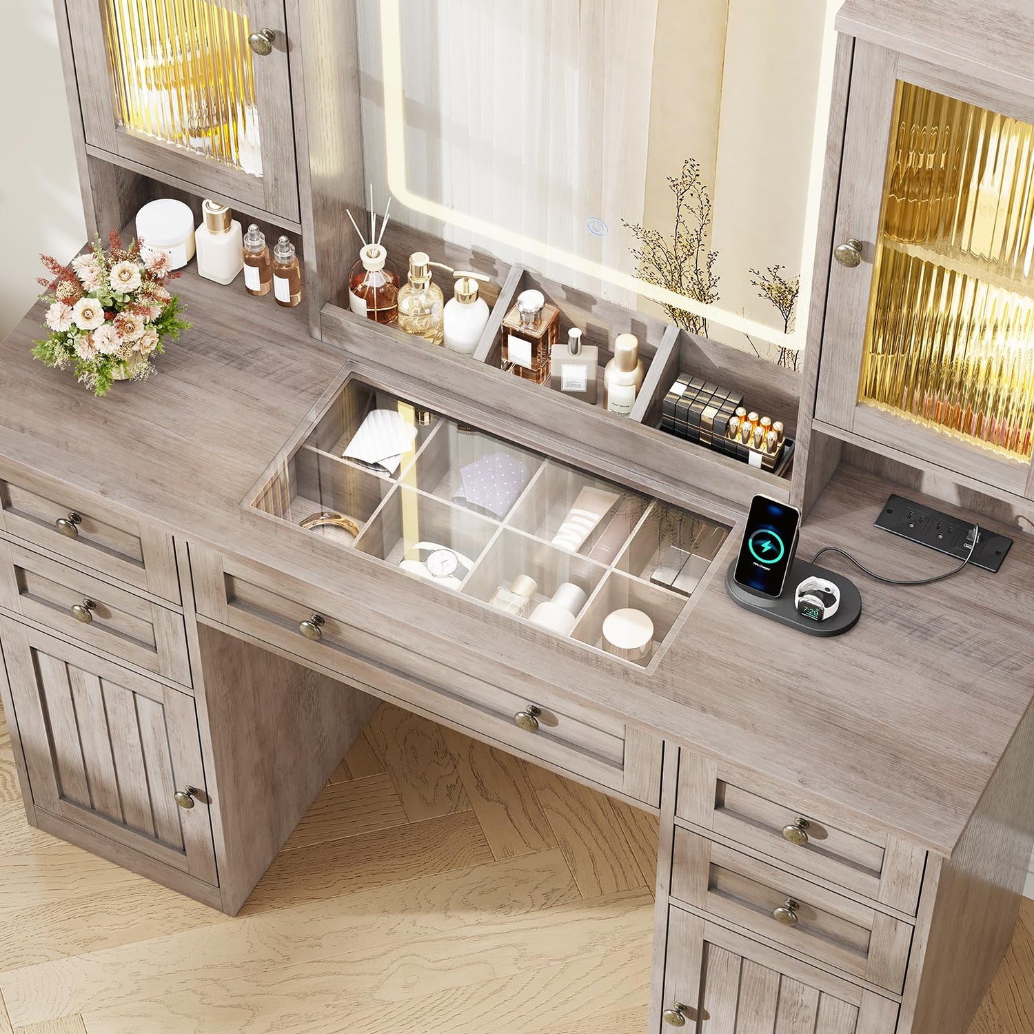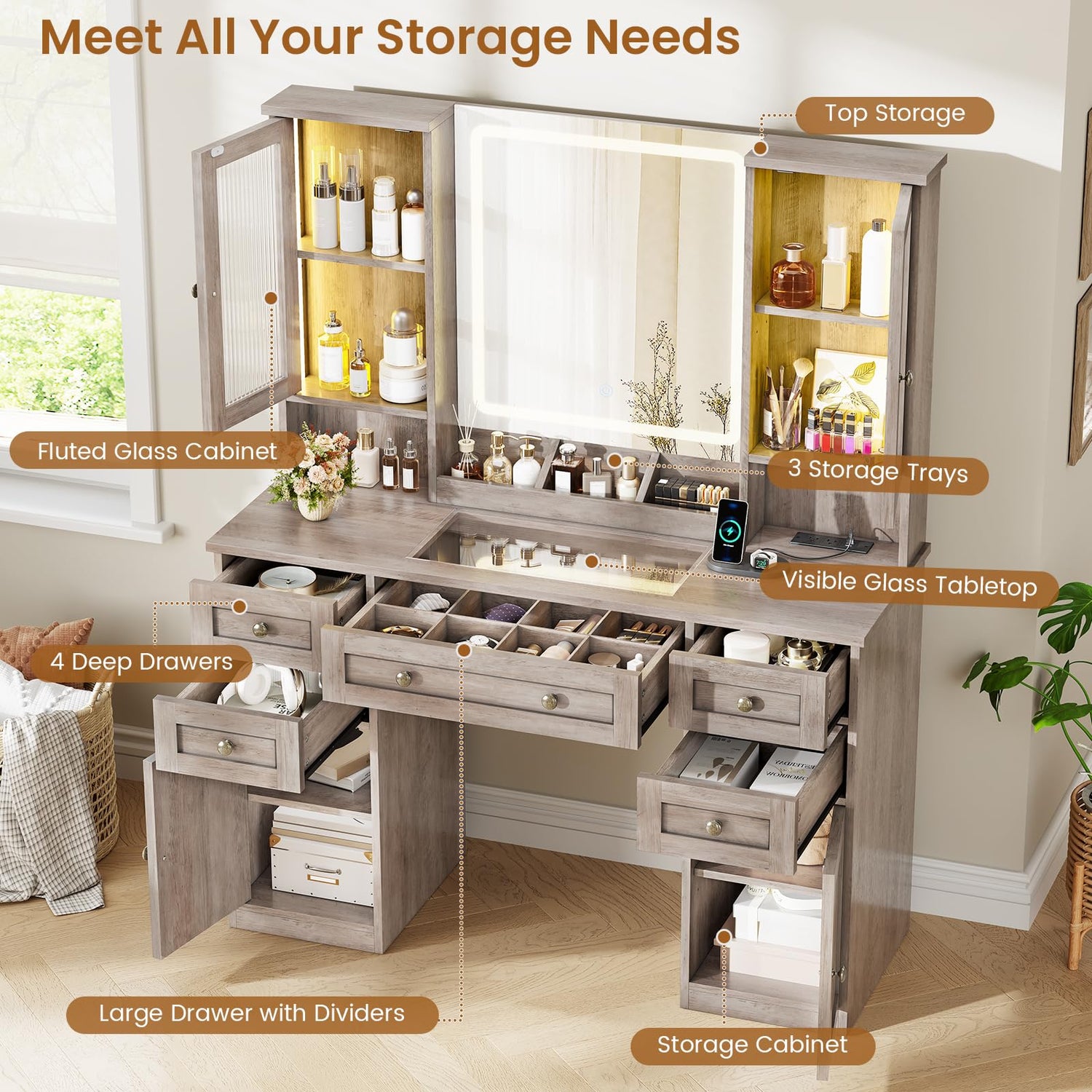 MSmask Vanity Desk with LED Mirror & 3 Color Modes, Large Makeup Vanity with 2 RGB Lights Cabinets, Glass Top Vanity Table with 5 Drawers & Power Outlet, Farmhouse Vanity, Grey