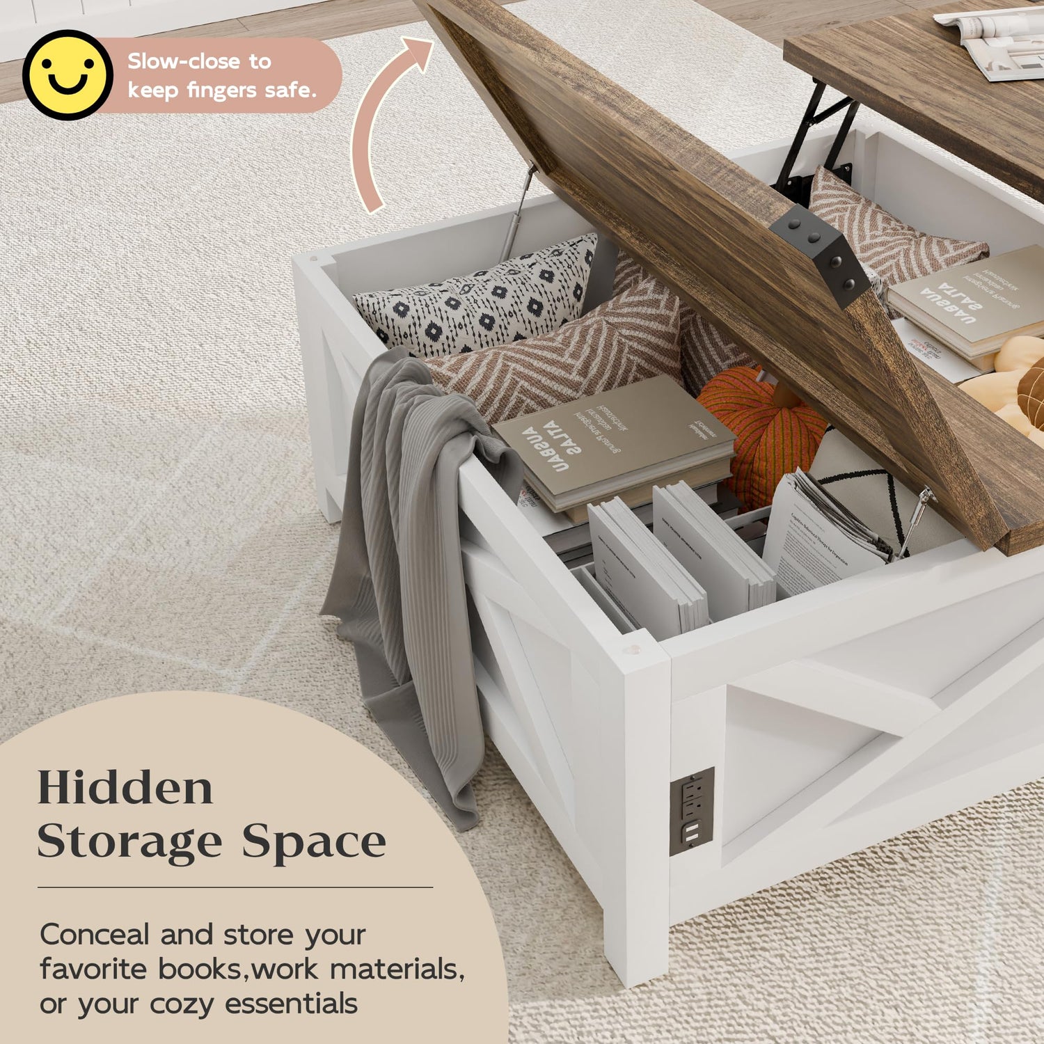 MU Lift Top Coffee Table, Square Coffee Table with Hidden Storage, Farmhouse Wood Table with Charging Station and Barn Door for Living Room, White