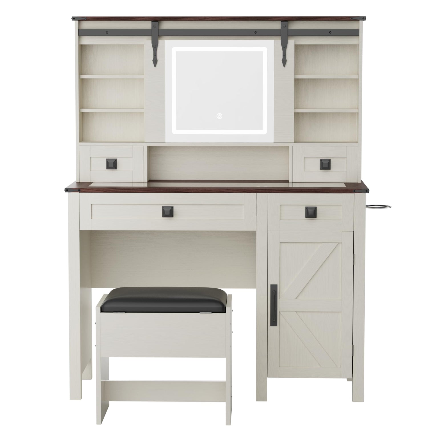 NEWBULAND Farmhouse Vanity with Mirror and Lights, 42" White Vanity Desk with 4 Drawers and Benches Makeup Table Set