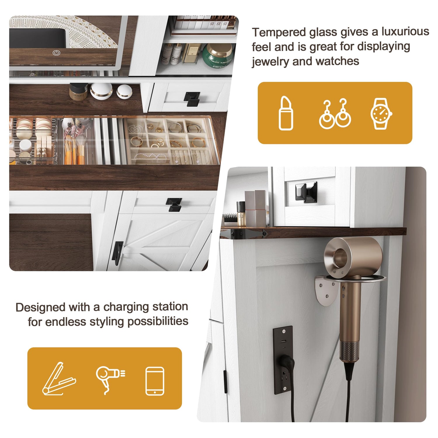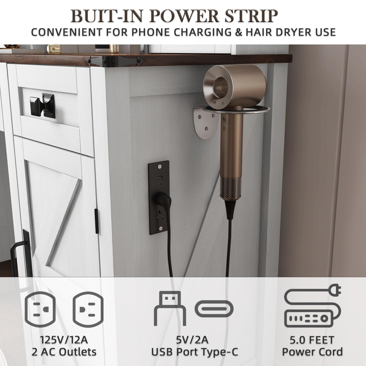 - Multifunctional Women's Vanity: This desk vanity features a built-in charging station and hair dryer holder. The vanity includes a charging station on the tabletop with USB and Type-C ports, plus 2 sockets, allowing you to charge mobile phones or other small electronic devices