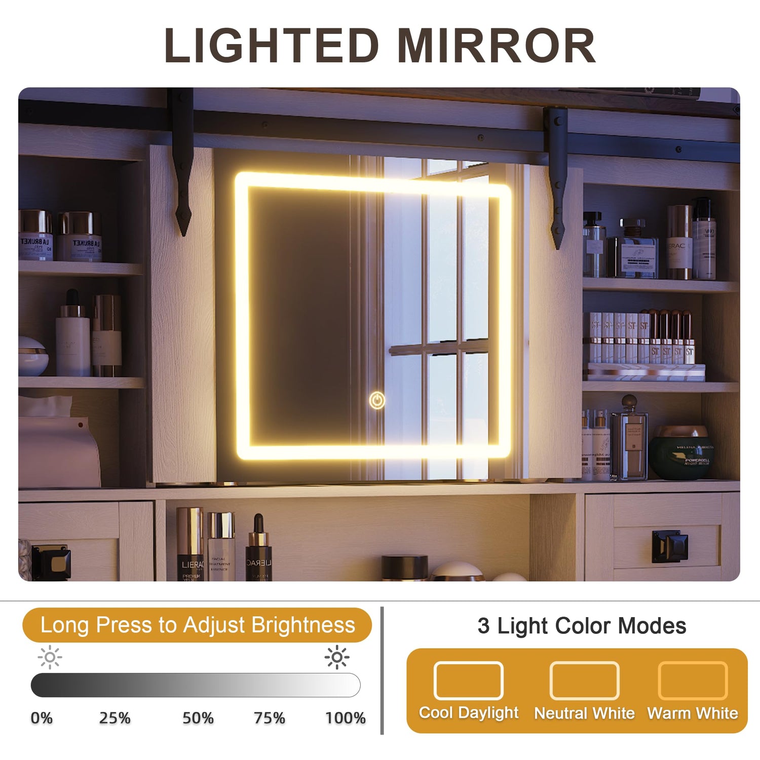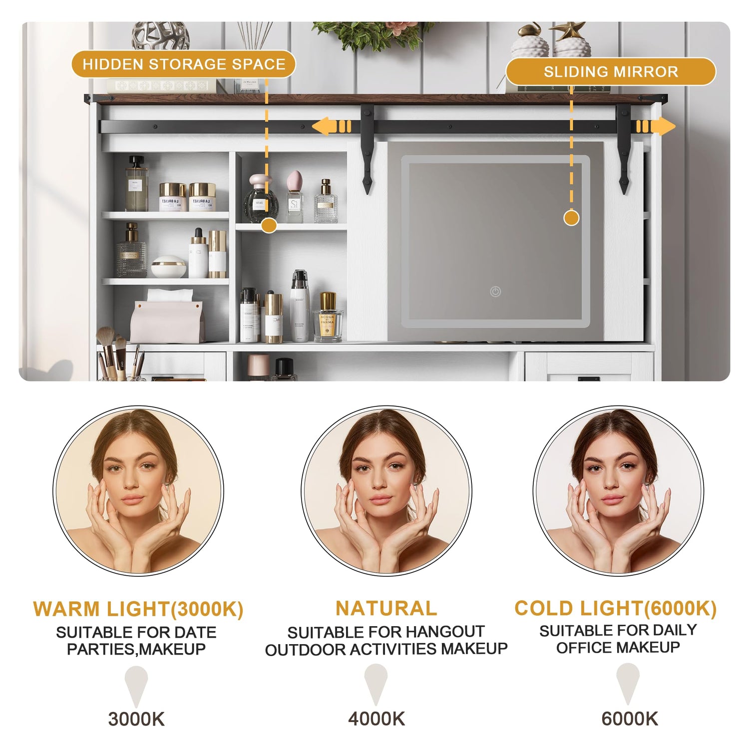 - 3-Color Modes Makeup Vanity: White vanity desk with mirror and lights offers cool white, warm white, and warm yellow lighting options. The touch switch allows you to customize both color and brightness