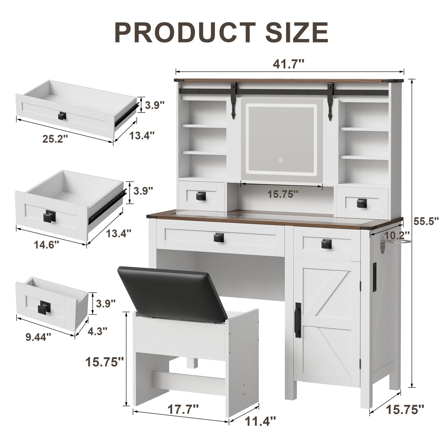 - Powerful Storage Capacity Tocador, Farmhouse vanity dimensions: 41.7"L x 15.8"W x 55.5"H. This make up vanity features 4 drawers,1 storage cabinet,and 9 open storage shelves, which can help you organize cosmetics into different areas as desired
