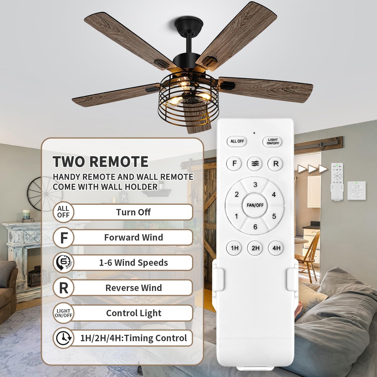 • 【Noiseless Motor and Timing】Industral ceiling fans with lights equipped inverter 6-speed 35W silent DC motor with less resistance, less noise ≦ 26dbM (ideal sleeping enviroment), 50% higher motor power makes fandelier safer and more durable.The caged rustic ceiling fan features a timer function that can be set for 1, 2 or 4 hours to ensure a quiet and comfortable environment.