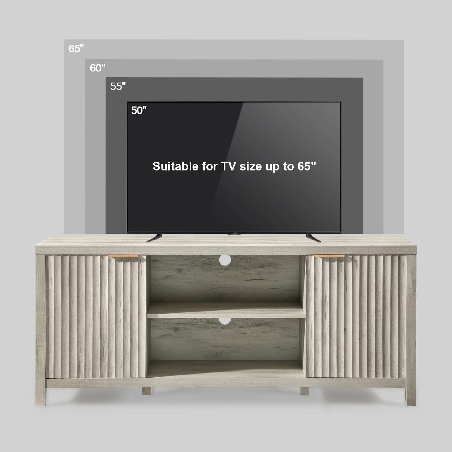 OAKHAM HOME Fluted TV Stands for Living Room, Heavy Duty Entertainment Center with Storage, Mid Century Modern Television Stands for 50/55/60/65 TV, Oxford Media TV Console (Grey Oak)