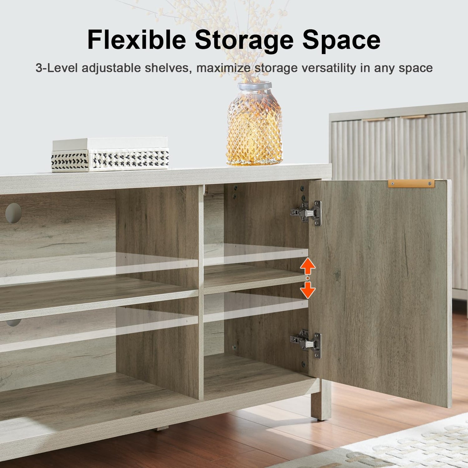 - Ample Storage with Two Cabinets and Shelves: The tv console table features two cabinets and two storage slots, and the shelves are adjustable, allowing you to customize the space to accommodate a variety of storage needs. The thoughtful inclusion of a cable hole behind the cabinet ensures a tidy and clutter-free appearance by discreetly managing cables. This TV stand for bedroom allows you to efficiently categorize and store items, providing ample space for arranging CDs, DVDs, and decorative elements, creating an environment that effortlessly combines comfort and modern flair.
