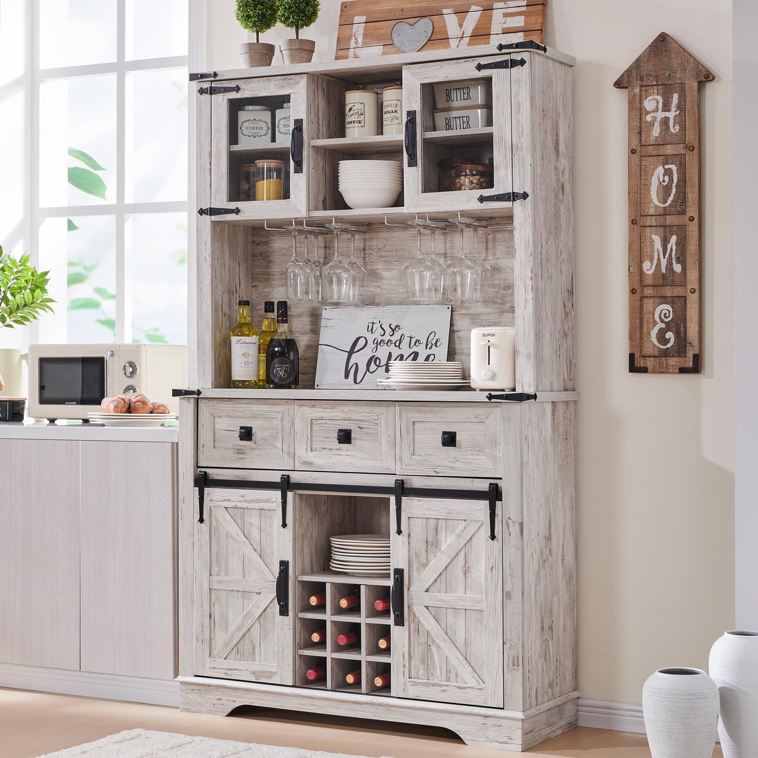 Details: OKD 72" Farmhosue Bar Cabinet with Sliding Barn Door, Large Kitchen Buffet with Hutch w/Wine & Glasses Rack, 3 Drawers, 12 Storage Shelves, Rustic Coffee Bar Sideboard Table, Antique Brush White