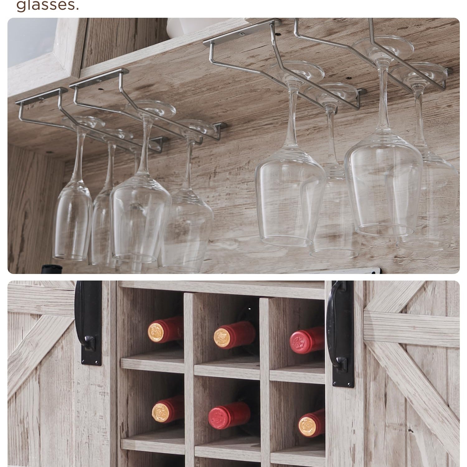- Farmhouse Home Bar Furniture with Sliding Barn Door: OKD Rustic wine cabinet features two flexible sliding barn doors allow easy access to cabinets and space saving. The sliding door with farmhouse sign create an elegant, farmhouse ambiance in your living space. Flexibly use it as a alcohol cabinet, kitchen pantry, china cabinet, coffee bar station, microwave stand, kitchen cupboard, credenza, storage cabinet.