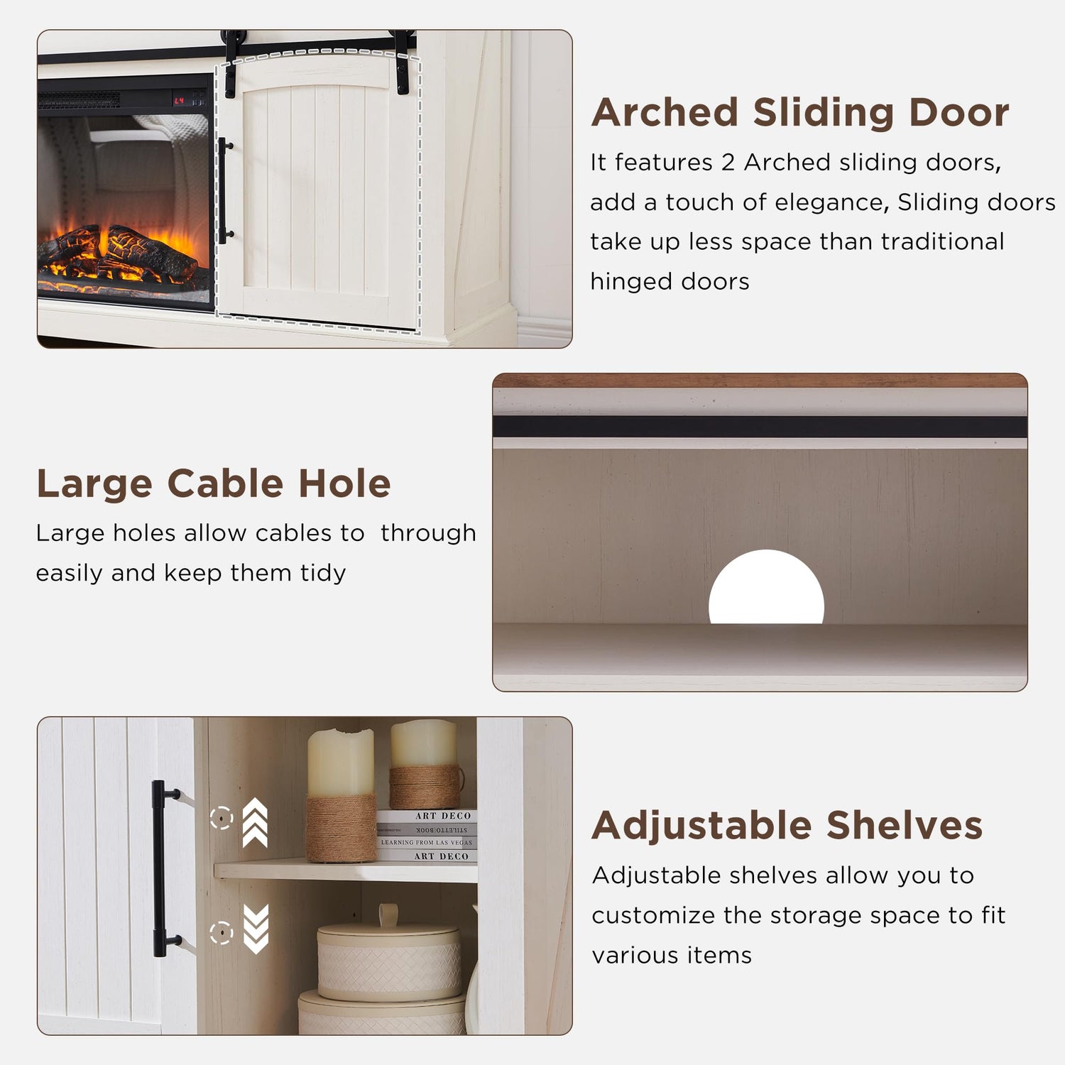 OKD Farmhouse Fireplace TV Stand for 70 Inch TV, 34" Tall Highboy Entertainment Center w/Electric Fireplace, Rustic Media Console w/Sliding Arched Door for Living Room,Antique White