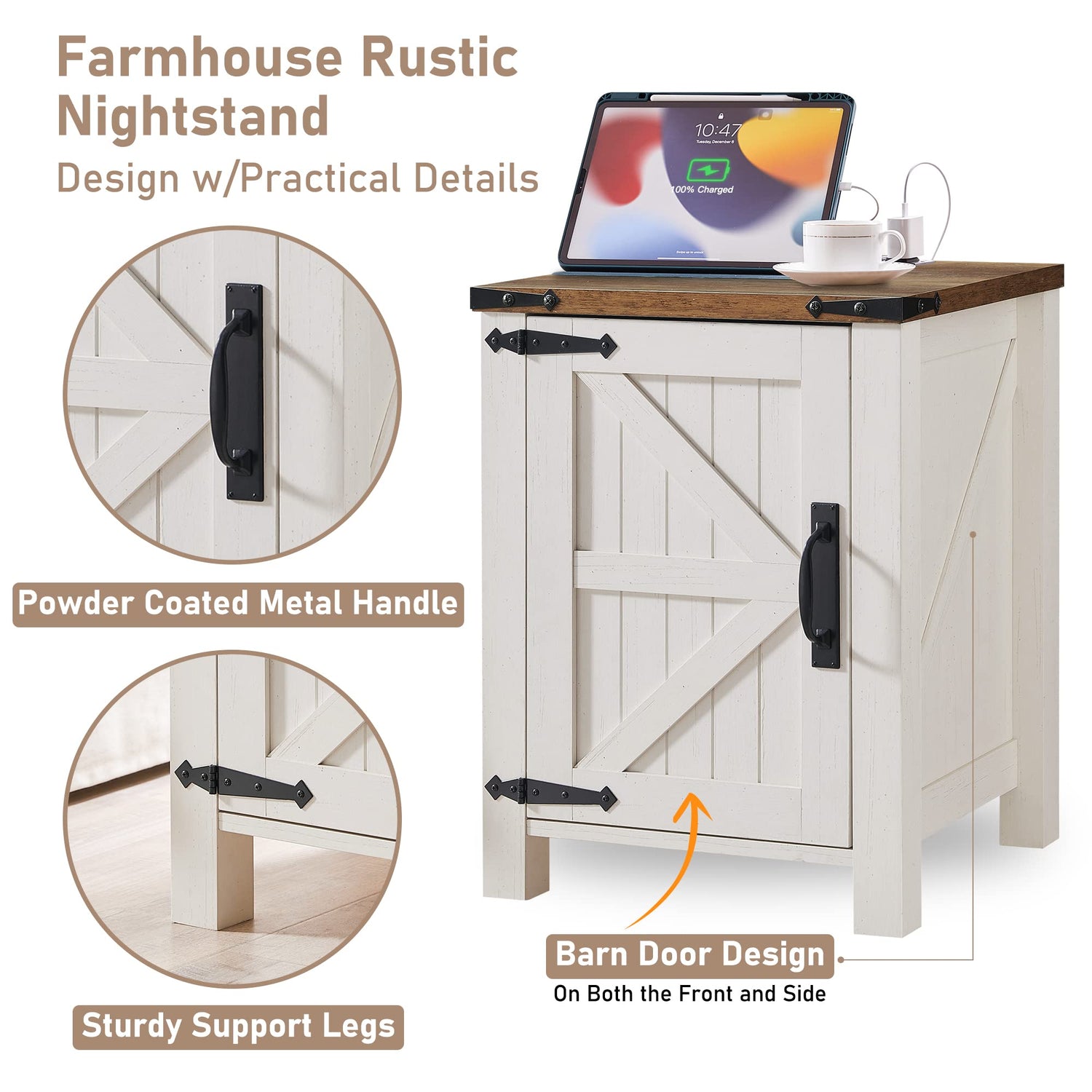 - CHIC FARMHOUSE BARN DOOR STYLE: This farmhouse nightstand design with a special barn-door pattern on front and two sides, and a metal corner decoration on two corners and doors, bringing the atmosphere of a farmhouse to your bedroom and living room. An additional charging station with 2 standard AC outlets and 2 USB ports, makes it more convenient to charging your cell phone in your bedroom or living room. A great addition to your home, making your house more attractive and orderly