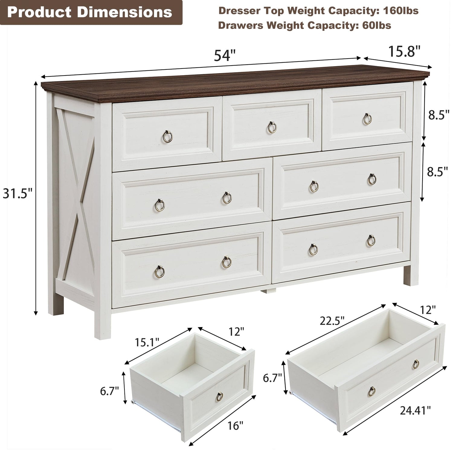 - Large Dresser: With a large 54"W x 15.8"D tabletop, this wide dresser offers ample space to display photo frames, ornaments, and keep everything organized and clutter-free