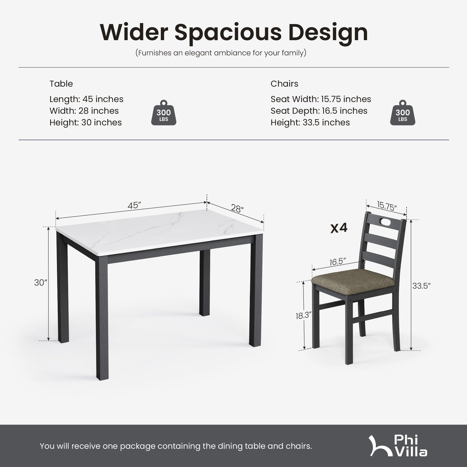 PHI VILLA Dining Table Set for 4, Modern Farmhouse Kitchen Table Set, Faux Marble Dining Table and 4 Cushioned Chairs, Solid Rubber Wood Dining Room Table Set, Venatino White Marble& Black