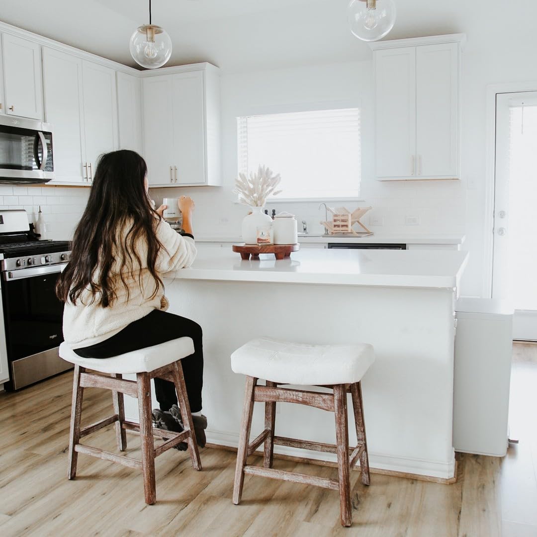 • Space-saving Bar Stools: With dimensions of 20 inches wide, 14 inches deep, and 24 inches high. Backless seats can scoot almost all the way under the countertop to give you more wiggle room when not in use. Available in different finishes!