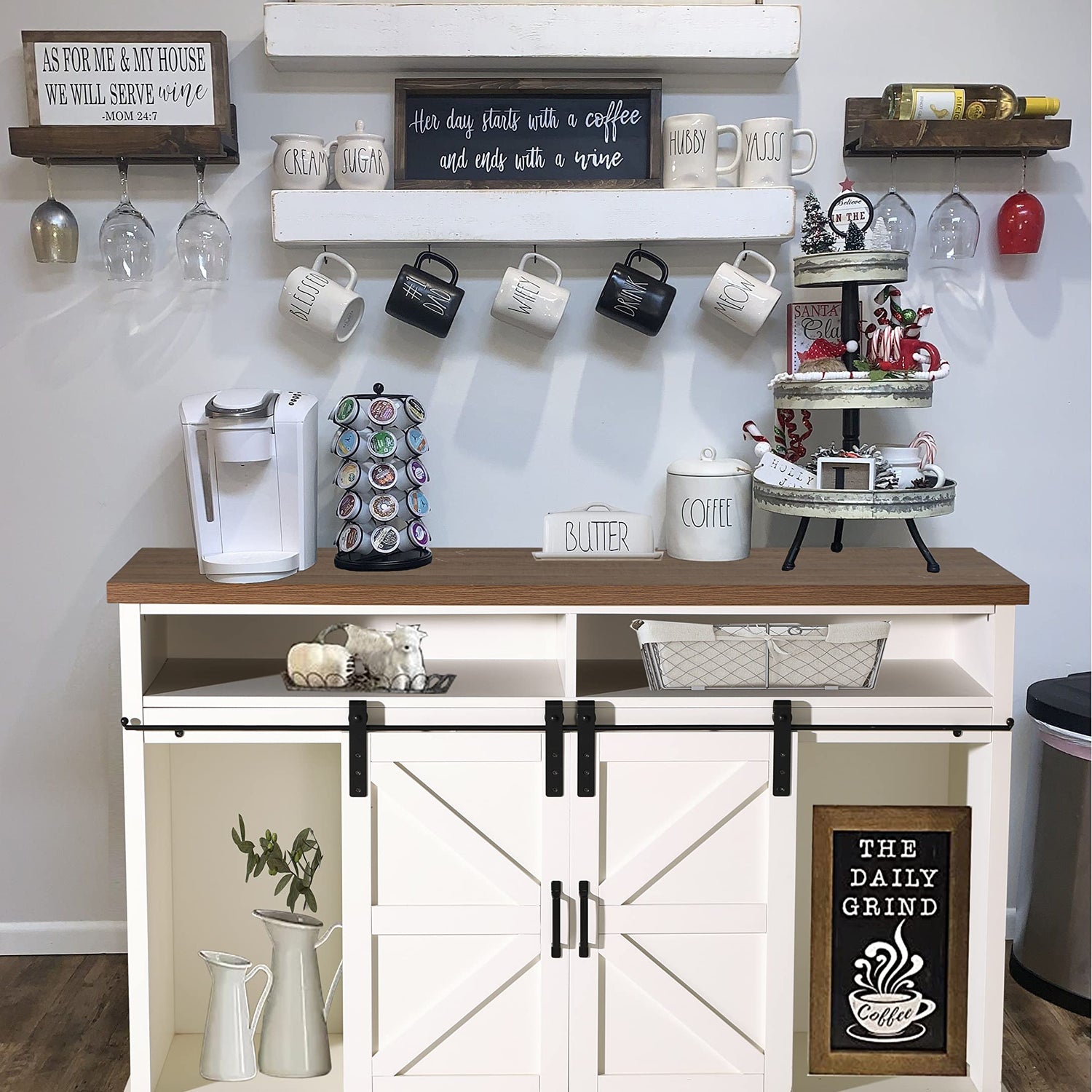 - Sturdy and Durable Coffe Bar Cabinet - Composed of high grade warp-resistant MDF and durable laminate with metal elements, the farmhouse coffee bar cabinet with stands the challenge of long-term use. Fixed shelves make the cabinets' structure maintain better stability. Overall load capacity: 300 LB