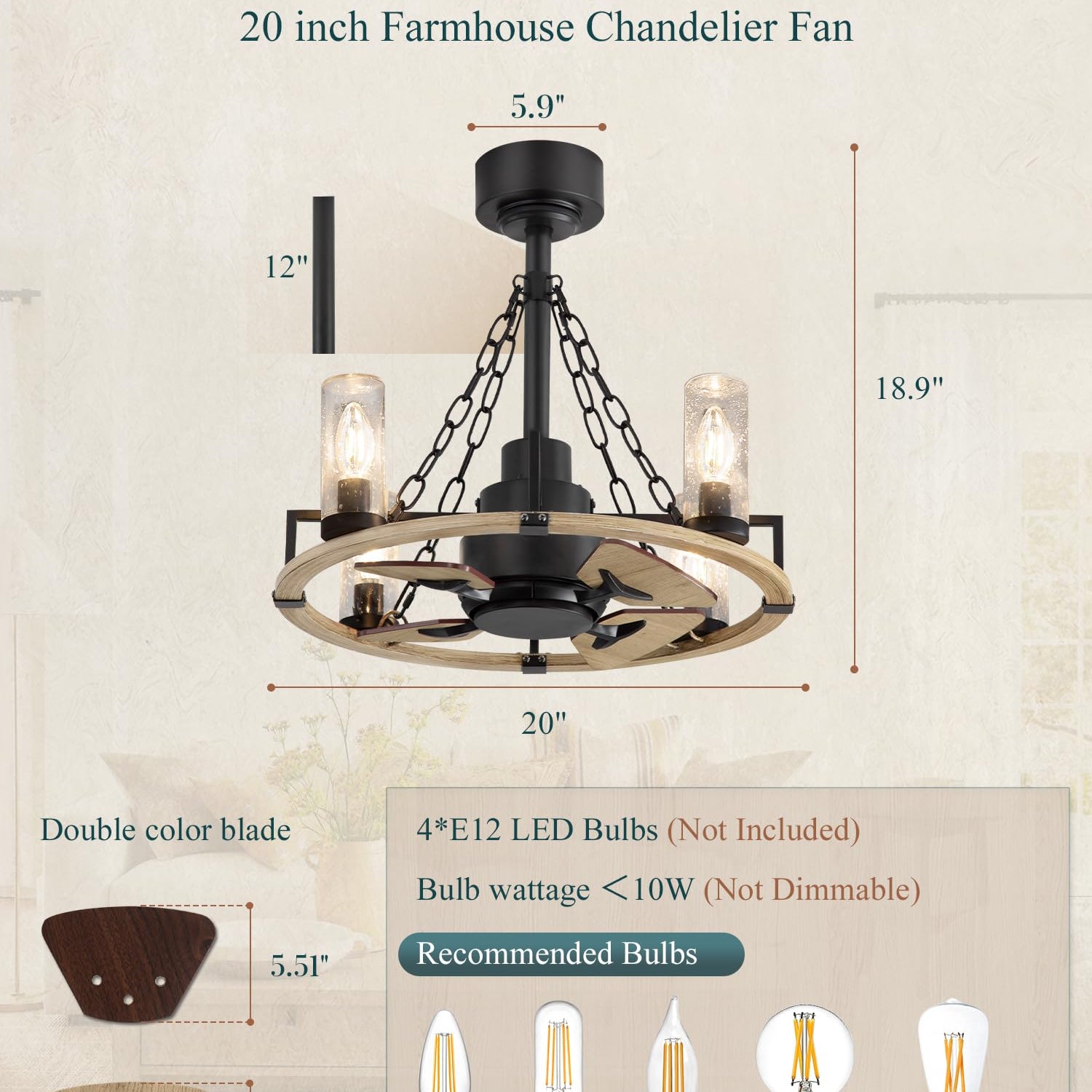 - LED Candle Bulbs: This chandelier fan has 4 E12 bulb bases (10W max each, bulbs not included), allowing you to install preferred bulbs for a favourite warm glow. Please note: dimmers are not supported