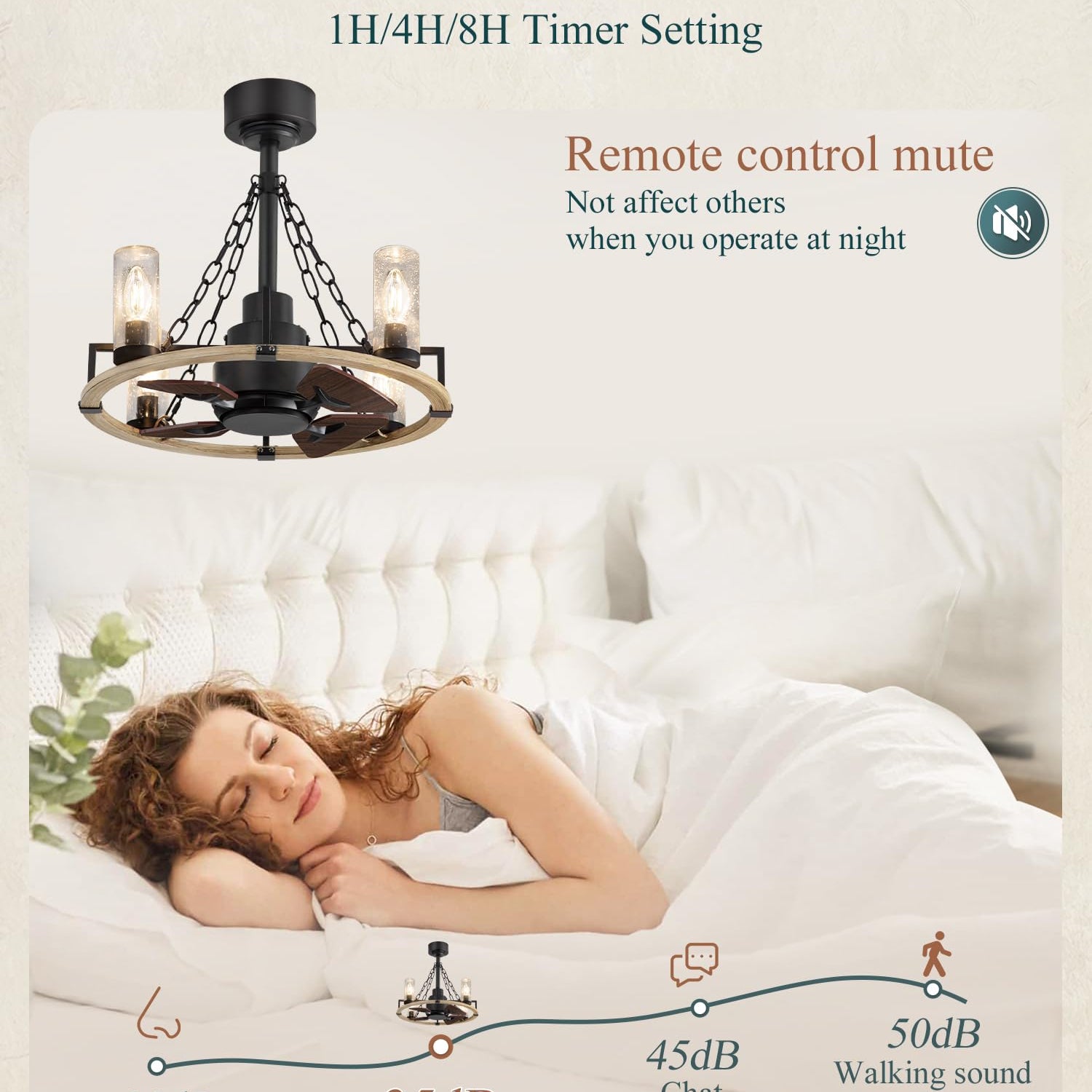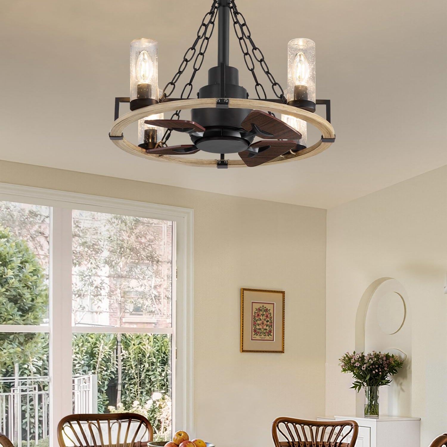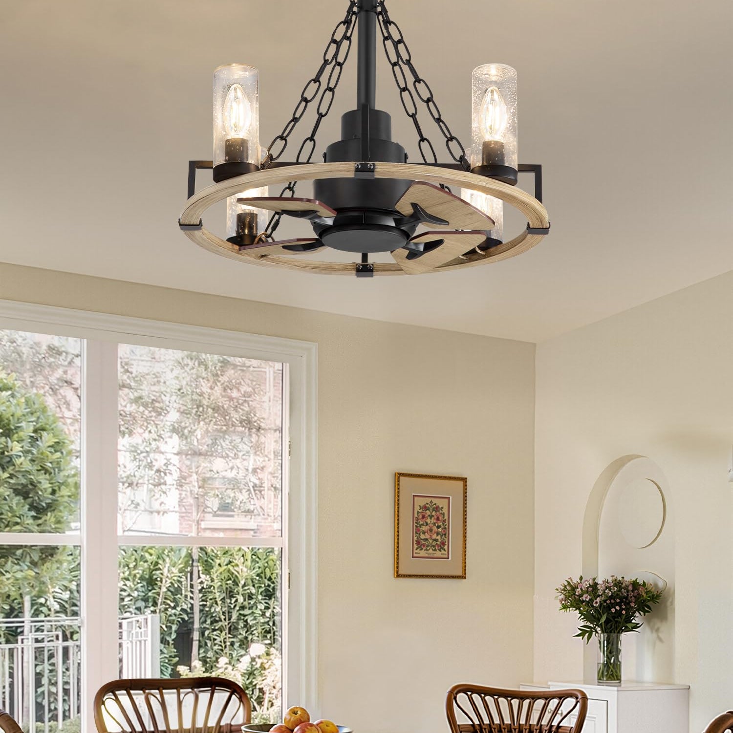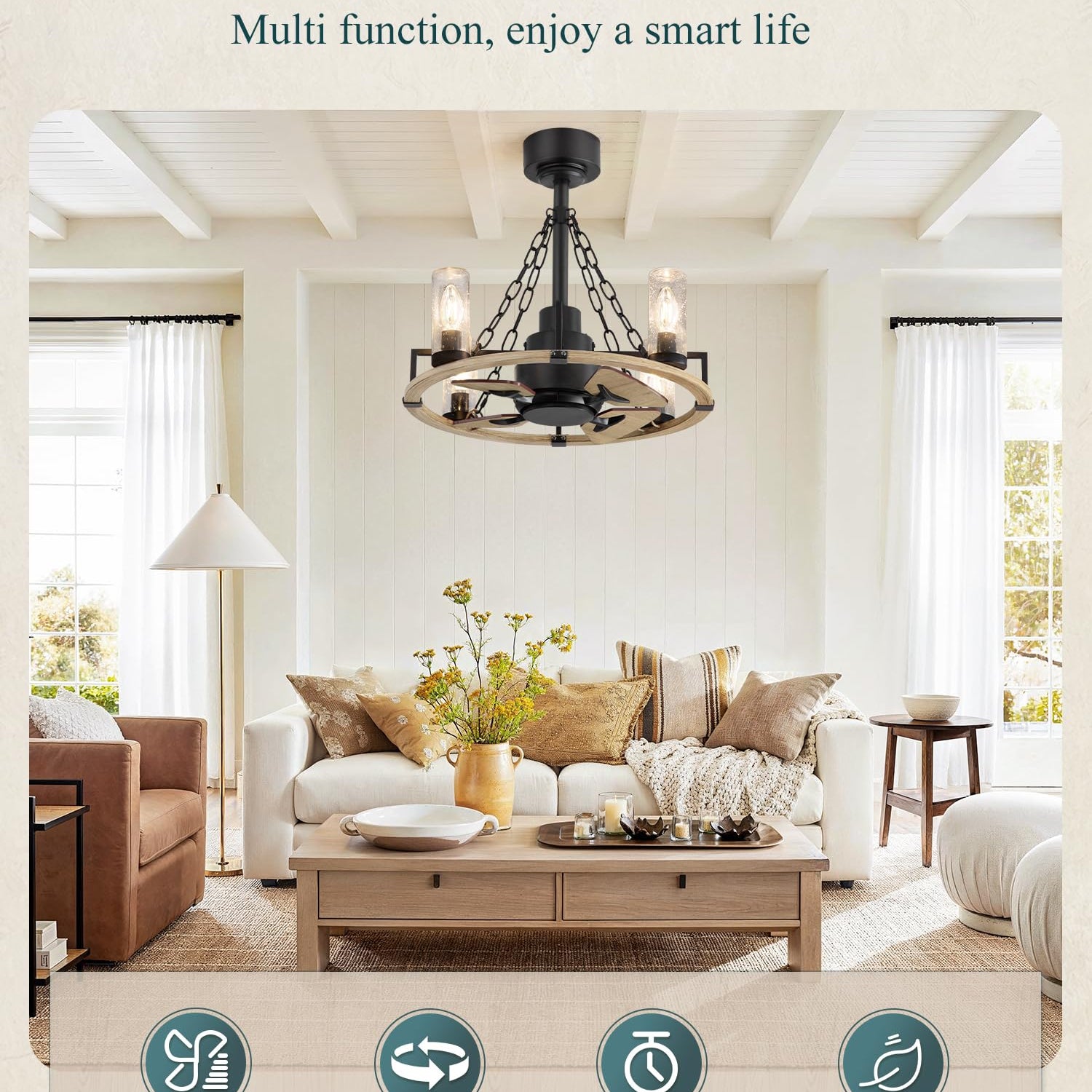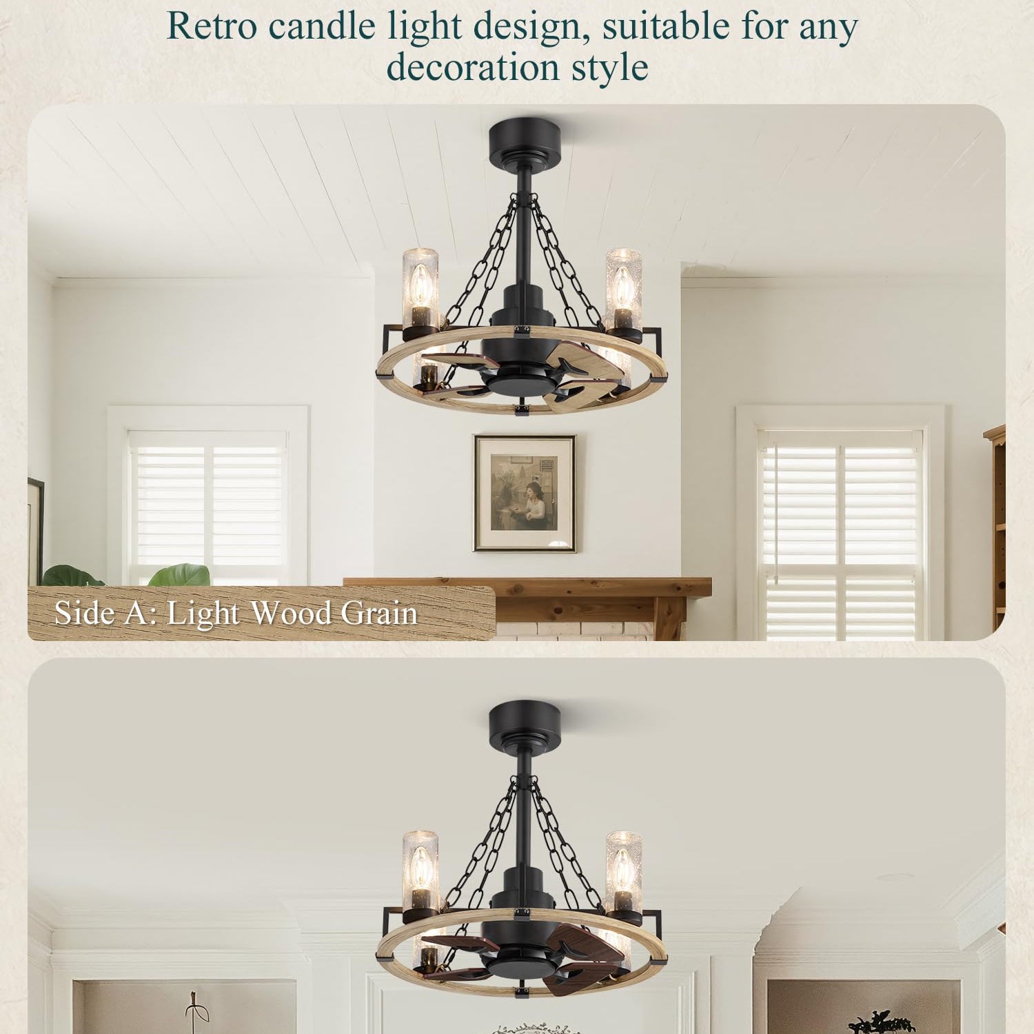 POWIFY 20 Inch Wagon Wheel Chandelier with Fan, Farmhouse Chandelier Fan with Remote, Quiet Reversible Motor, Dual Finish Blades, Black Rustic Ceiling Fan for Bedroom Dining Room Living Room Kitchen