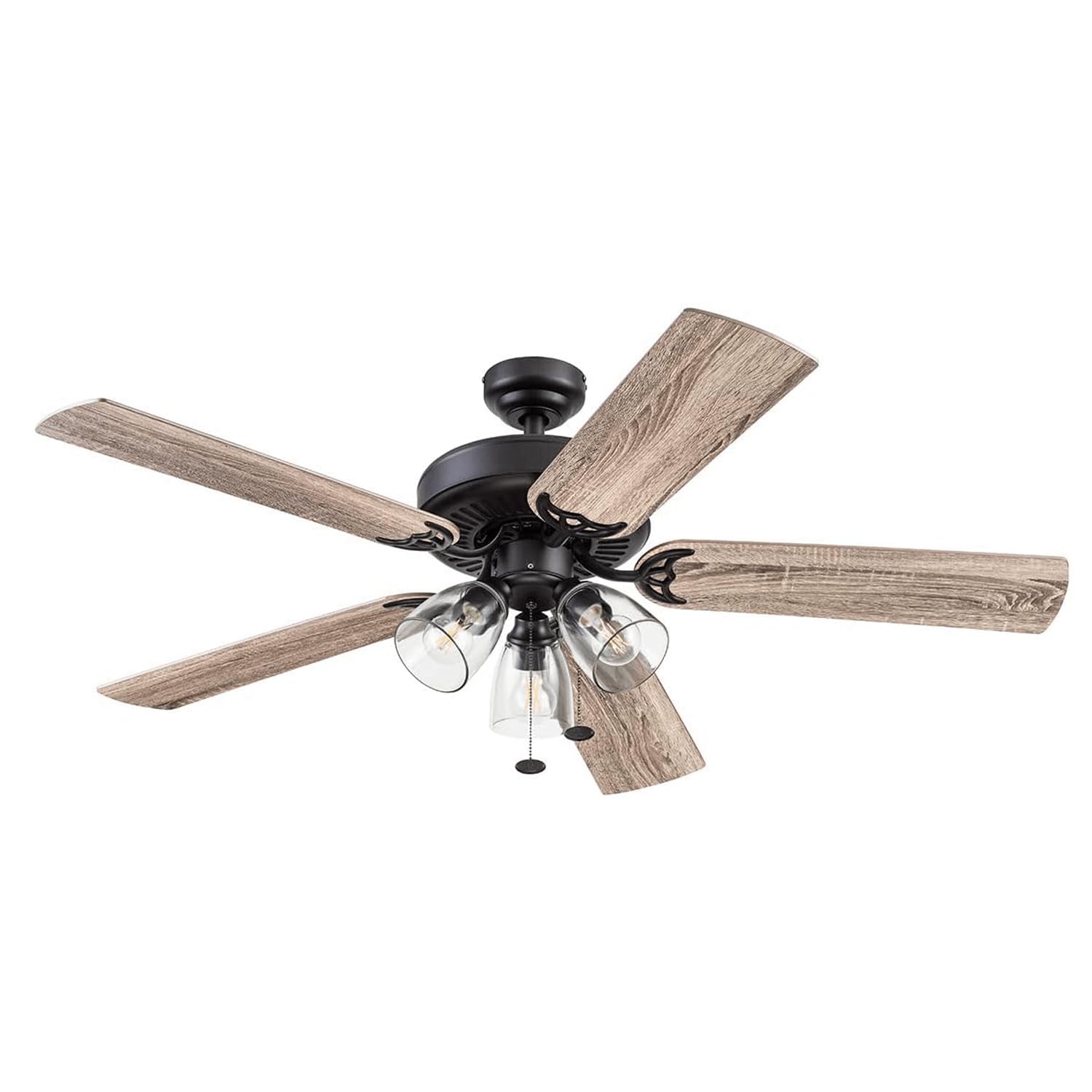 The Saybrook dry-rated modern farmhouse ceiling fan with light combines stylish details with modern influences for a truly inspiring fixture for your home. Its bold hardware, modern clear glass and Edison-style dimmable LED lighting accompany an innovative 5-blade design that provides adjustable, energy-efficient airflow. Control your Prominence Home large ceiling fan with lights with two easy-to-use pull chains, or pair with a universal ceiling fan remote (not included). For year-round comfort, change the direction of this modern ceiling fan with light to reverse airflow. During summer, this ceiling light with fan provides a cooling effect, and throughout winter, our strong fan can reverse to spread warm air, helping reduce energy costs. This gorgeous light bulb fan blends with many decor styles. When paired with your decor, this farmhouse ceiling fan can transform into a mid-century modern ceiling fan, boho vintage ceiling fan, or the industrial ceiling fan with light you've been seeking. The LED Edison bulbs provide 2400 lumens and 2700k color temperature. Whether you need room fans for bedrooms, a home office fan, or living room ceiling fan, this wood ceiling fan with light has you covered.