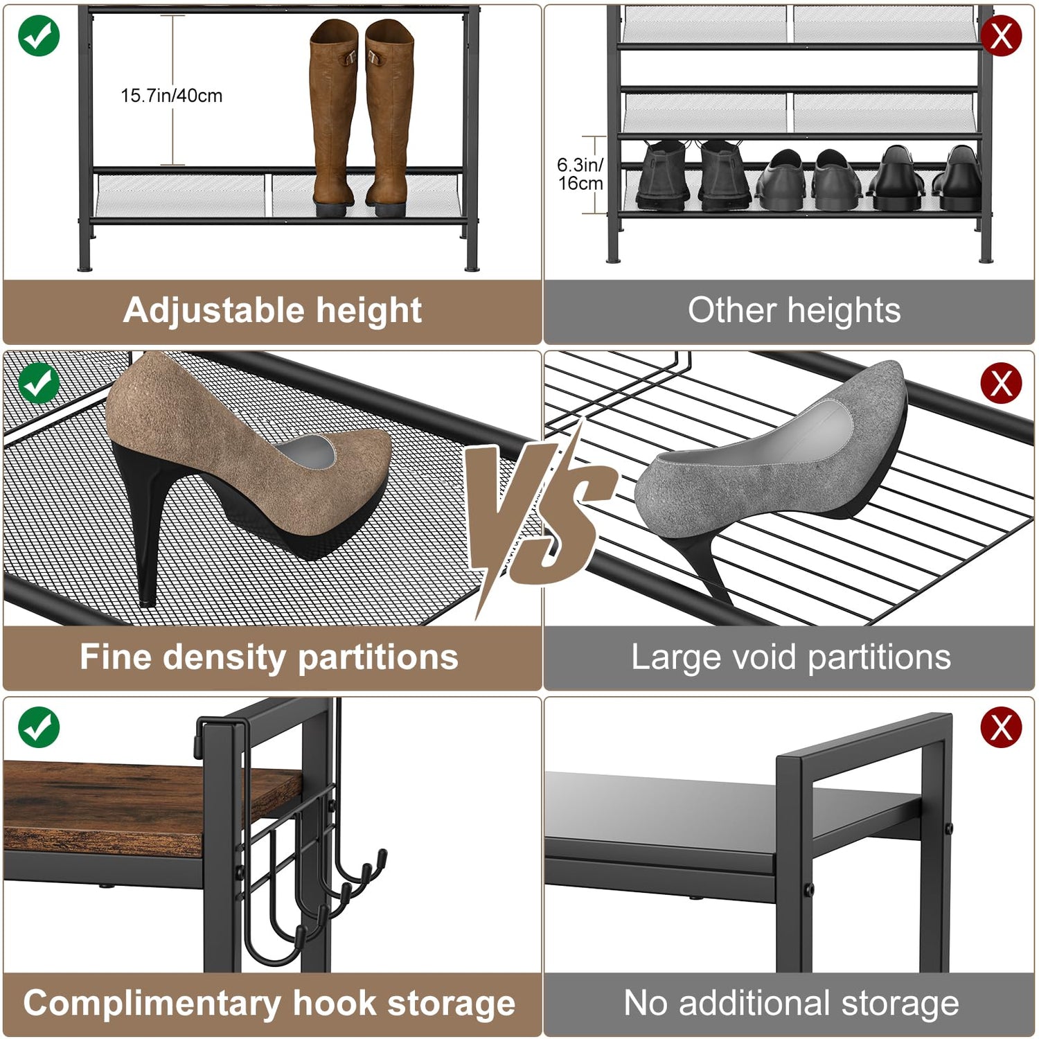 - Upgraded Design: This shoe organizer cabinet is equipped with a row of hooks, providing you with extra storage space for hanging umbrellas, keys, headphones, bags, hats, shopping bags, rackets, etc.; in addition, we increased the height of each compartment during production, which is more suitable for most types of shoes. The mesh surface of the compartment is also upgraded and encrypted to avoid the problem of high heels getting stuck. This shoe organizer provides additional thoughtful design to help maximize the use of limited space to meet your daily storage needs